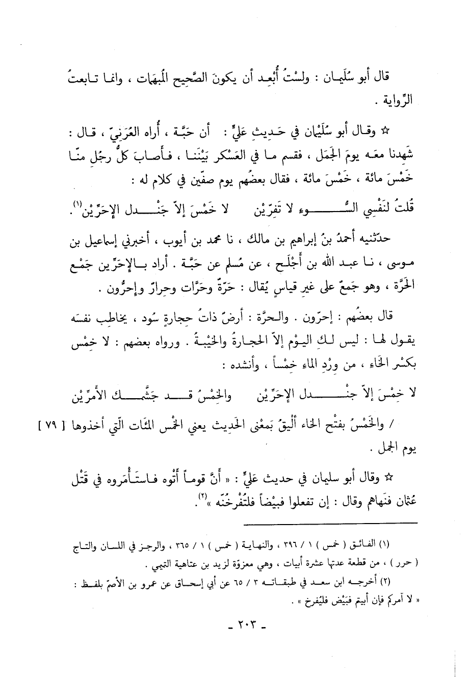 وَقَالَ أَبُو سُلَيْمَانَ فِي حَدِيثِ عَلِيٍّ أَنَّ حَبَّةَ أَرَاهُ الْعُرَنِيَّ قَالَ: شَهِدْنَا مَعَهُ يَوْمَ الْجَمَلِ فَقَسَّمَ مَا فِي الْعَسْكَرِ بَيْنَنَا أصاب كُلُّ رَجُلٍ مِنَّا خَمْسَ مِائَةٍ خَمْسَ مِائَةٍ فَقَالَ بَعْضُهُمْ: يَوْمَ صِفِّينَ فِي كَلامٍ لَهُ: