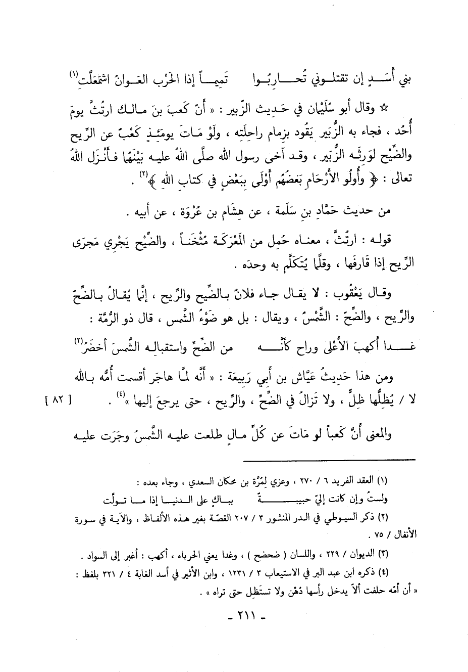 وَقَالَ أَبُو سُلَيْمَانَ فِي حَدِيثِ الزُّبَيْرِ أَنَّ كَعْبَ بْنَ مَالِكٍ ارْتُثَّ يَوْمَ أُحُدٍ فَجَاءَ بِهِ الزُّبَيْرُ يَقُودُ بِزِمَامِ رَاحِلَتِهِ وَلَوْ مَاتَ يَوْمَئِذٍ كَعْبُ عَنِ الرِّيحِ وَالضِّيحِ لَوَرِثَهُ الزُّبَيْرُ وَقَدْ آخَى رَسُولُ اللَّهِ صَلَّى اللَّهُ عَلَيْهِ وَسَلَّمَ بَيْنَهُمَا فَأَنْزَلَ اللَّهُ تَعَالَى: {وَأُولُو الْأَرْحَامِ بَعْضُهُمْ أَوْلَى بِبَعْضٍ فِي كِتَابِ اللَّهِ} 1.