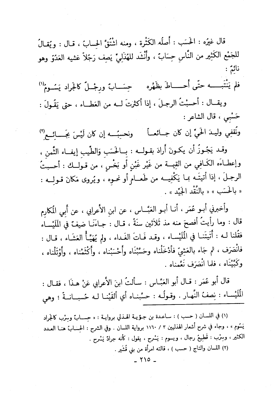 قال غيره الحسب أصله الكثرة ومنه اشتق الحساب قَالَ ويقال للجمع الكثير من الناس حساب وأنشد للهذلي يصف رجلا غشيه العدو وهو نائم.