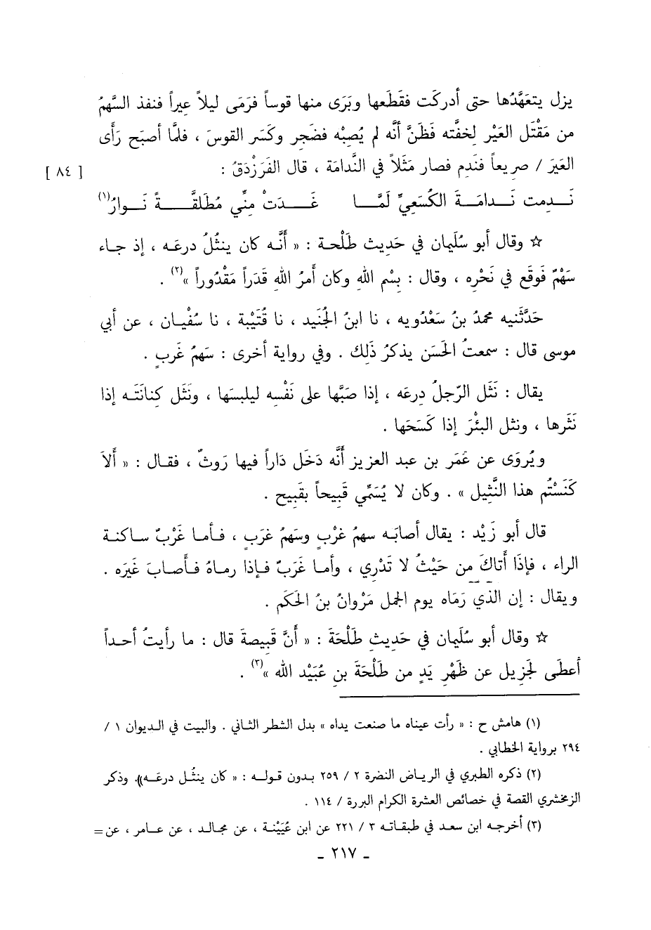وَقَالَ أَبُو سُلَيْمَانَ فِي حَدِيثِ طَلْحَةَ أَنَّهُ كَانَ يَنْثُلُ دِرْعَهُ إِذْ جَاءَ سَهْمٌ فَوَقَعَ فِي نَحْرِهِ وَقَالَ بِسْمِ اللَّهِ وَكَانَ أَمْرُ اللَّهِ قَدَرًا مَقْدُورًا 1.