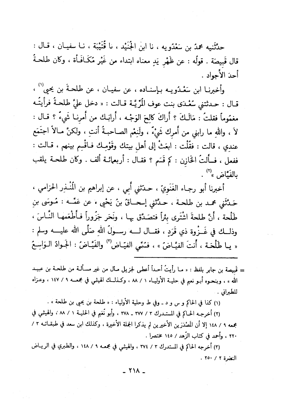 وَأَخْبَرَنَا ابْنُ سَعْدَوَيْهِ بِإِسْنَادِهِ عَنْ سُفْيَانَ عَنْ طَلْحَةَ بْنِ يَحْيَى 1 قَالَ حَدَّثَتْنِي سُعْدَى بِنْتُ عَوْفٍ الْمُرِّيَّةُ قَالَتْ دَخَلَ عَلَيَّ طَلْحَةُ فَرَأَيْتُهُ مَغْمُومًا فَقُلْتُ مَا لَكَ أَرَاكَ كَالِحَ الْوَجْهِ أَرَابَكَ مِنْ أَمْرِنَا شَيْءٌ قَالَ لا وَاللَّهِ مَا رَابَنِي مِنْ أَمْرِكِ شَيْءٌ وَلَنِعْمَ الصَّاحِبَةُ أَنْتِ وَلَكِنَّ مَالا اجْتَمَعَ عِنْدِي قَالَتْ فَقُلْتُ ابْعَثْ إِلَى أَهْلِ بَيْتِكَ وَقَوْمِكَ فَاقْسِمْ بَيْنَهُمْ قَالَتْ فَفَعَلَ فَسَأَلْتُ الْخَازِنَ كَمْ قَسَّمَ فَقَالَ أربعمائة أَلْفٍ. وكَانَ طَلْحَةُ يُلَقَّبُ بِالْفَيَّاضِ 2.