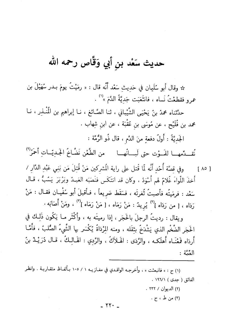 وَقَالَ أَبُو سُلَيْمَانَ فِي حَدِيثِ سَعْدٍ أَنَّهُ قَالَ رَمَيْتُ يَوْمَ بَدْرٍ سُهَيْلَ بْنَ عَمْرٍو فَقَطَعْتُ نَسَاهُ فَانْثَعَبَتْ جَدِيَّةُ الدَّمِ 1.