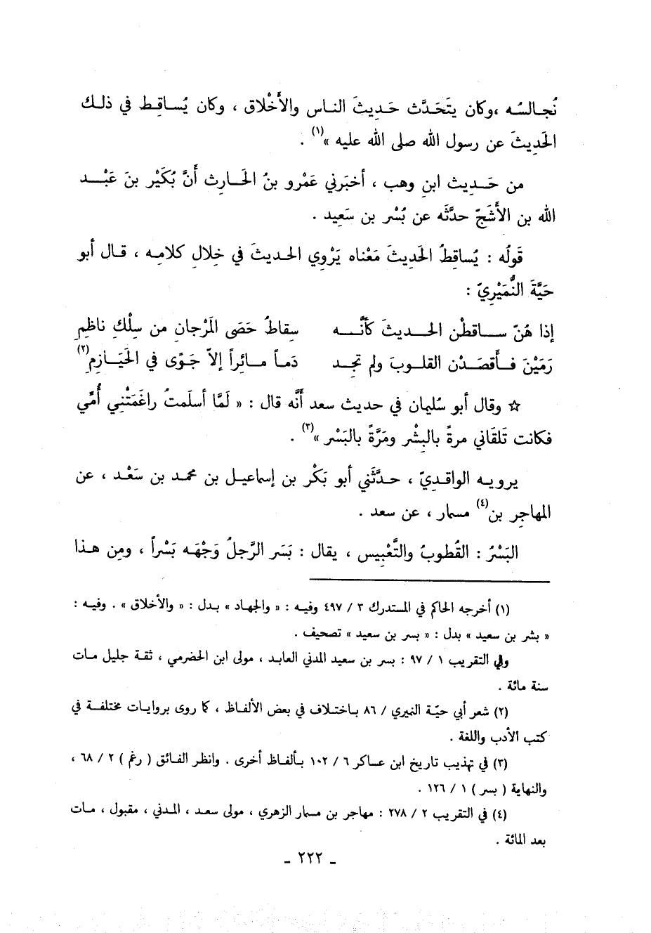 وَقَالَ أَبُو سُلَيْمَانَ فِي حَدِيثِ سَعْدٍ أَنَّ بُسْرَ بْنَ سَعِيدٍ قَالَ: كُنَّا نُجَالِسُهُ وَكَانَ يَتَحَدَّثُ حَدِيثَ النَّاسِ وَالأَخْلاقِ وَكَانَ يُسَاقِطُ فِي ذَلِكَ الْحَدِيثَ عَنْ رَسُولِ الله صلى الله عليه 1.