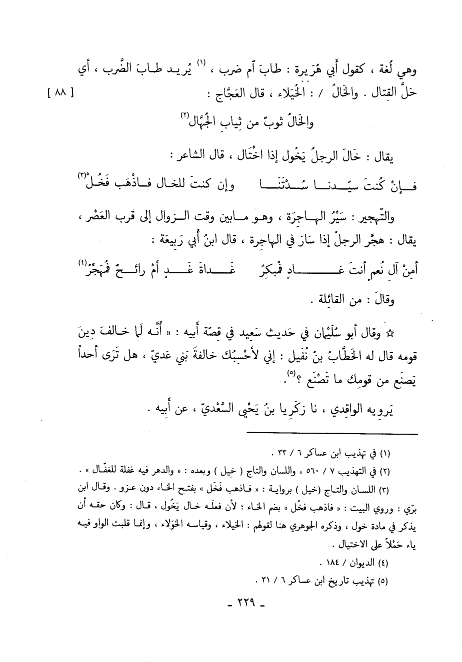 وهي لغة كقول أَبِي هُرَيْرَةَ طاب أم ضرب 1 يريد طاب الضرب أي حل القتال. والخال / الخيلاء قَالَ العجاج: [88]