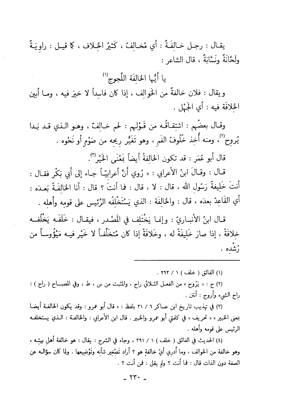 3 في تهذيب تاريخ ابن عساكر "6/ 31" بلفظ "قال أبو عمرو: وقد يكون الخالفة أيضا بمعنى الخبير" "تحريف" في كلمتي أبو عمرو والخير, قال ابن الأعرابي: وَالْخَالِفَةُ: الَّذِي يَسْتَخْلِفُهُ الرَّئِيسُ عَلَى قومه وأهله.
