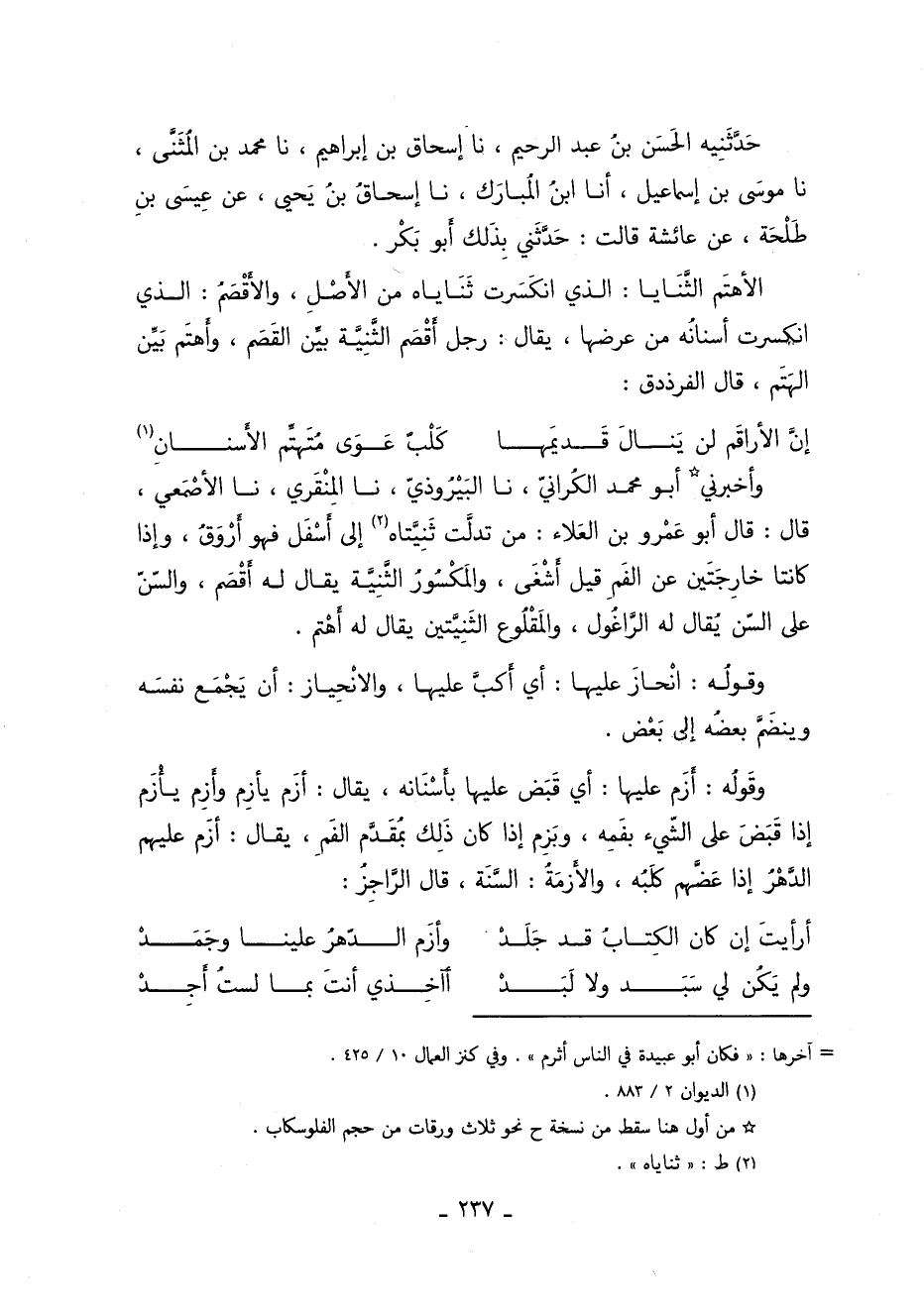 وَأَخْبَرَنِي* أبو محمد الكراني أخبرنا البيروذي أخبرنا المنقري أخبرنا الأصمعيّ قَالَ قَالَ أبو عمرو بن العلاء من تدلت ثنيتاه 2 إلى أسفل فهو أروق وإذا كانتا خارجتين عَنِ الفم قيل أشغى والمكسور الثنية يُقَالُ له: أقصم والسن على السن يُقَالُ له: الراغول والمقلوع الثنيتين يُقَالُ له: أهتم.