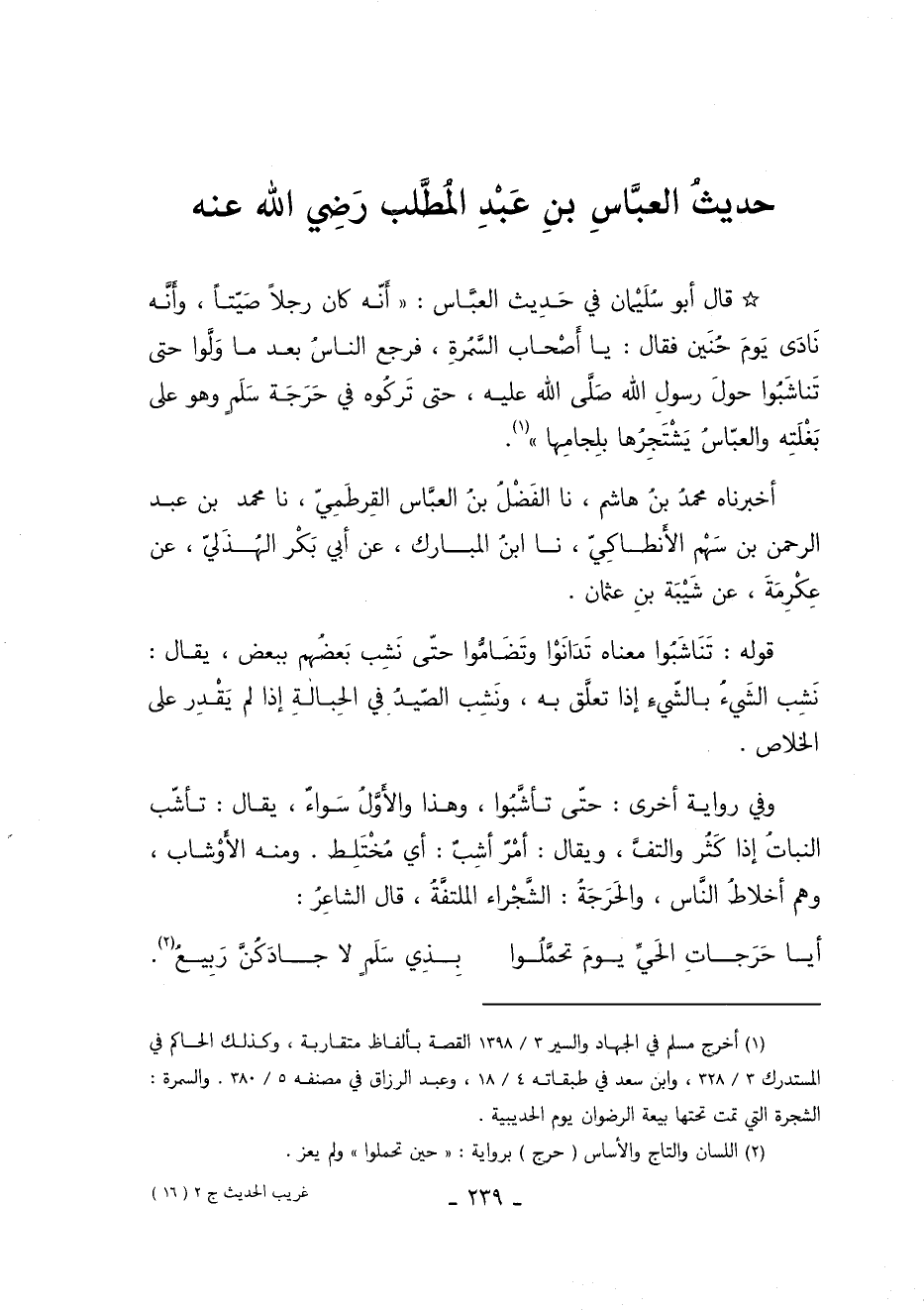 قَالَ أَبُو سُلَيْمَانَ فِي حَدِيثِ الْعَبَّاسِ أَنَّهُ كَانَ رَجُلا صَيِّتًا وَأَنَّهُ نَادَى يَوْمَ حُنَيْنٍ فَقَالَ: يَا أَصْحَابَ السَّمُرَةِ, فَرَجَعَ النَّاسُ بَعْدَ مَا وَلَّوْا حَتَّى تَنَاشَبُوا حَوْلَ رَسُولِ اللَّهِ صَلَّى اللَّهُ عَلَيْهِ وَسَلَّمَ حَتَّى تَرَكُوهُ فِي حَرَجَةِ سَلَمٍ وَهُوَ عَلَى بَغْلَتِهِ وَالْعَبَّاسُ يَشْتَجِرُهَا بِلِجَامِهَا 1.