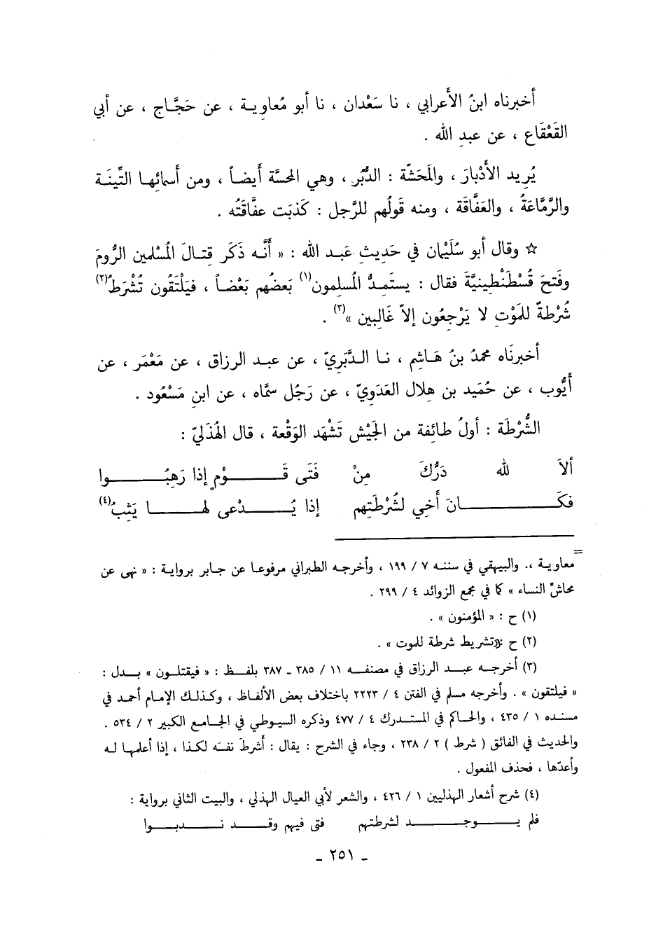 3 أخرجه عبد الرزاق في مصنفه "11/ 385 – 387" بلفظ "فيقتلون" بدل "فيلتقون" وأخرجه مسلم في الفتن "4/ 2223" باختلاف بعض الألفاظ وكذلك الإمام أحمد في مسنده "1/ 435" والحاكم في المستدرك "4/ 477" وذكره السيوطي في الجامع الكبير "2/ 534" والحديث في الفائق "شرط" "2/ 238" وجاء في الشرح يقال: أشرط نفسه لكذا إذا أعلمها له وأعدها فحذف المفعول.