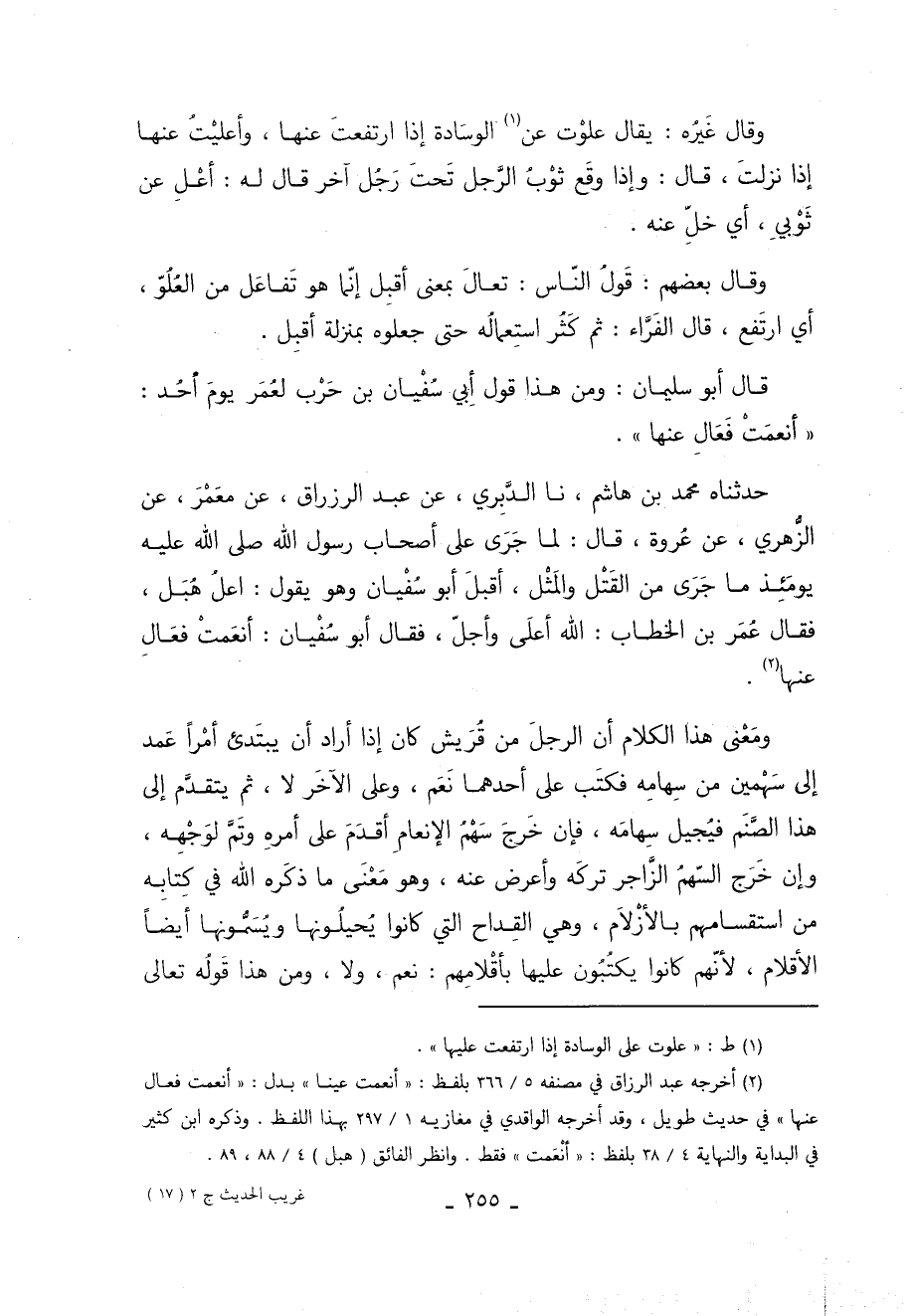 حَدَّثَنَاهُ مُحَمَّدُ بن هاشم أخبرنا الدبري عن عبد الرزاق عَنْ مَعْمَرٍ عَنِ الزُّهْرِيِّ عَنْ عُرْوَةَ قَالَ: لَمَّا جَرَى عَلَى أَصْحَابِ رَسُولُ اللَّهِ صَلَّى اللَّهُ عَلَيْهِ وَسَلَّمَ يَوْمَئِذٍ مَا جَرَى مِنَ الْقَتْلِ وَالْمَثْلِ أَقْبَلَ أَبُو سفيان وهو يقال: اعْلُ هُبَلَ فَقَالَ عُمَرُ بْنُ الْخَطَّابِ: اللَّهُ أَعْلَى وَأَجَلُّ فَقَالَ أَبُو سُفْيَانُ: أَنْعَمَتْ فَعَالِ عَنْهَا 2.