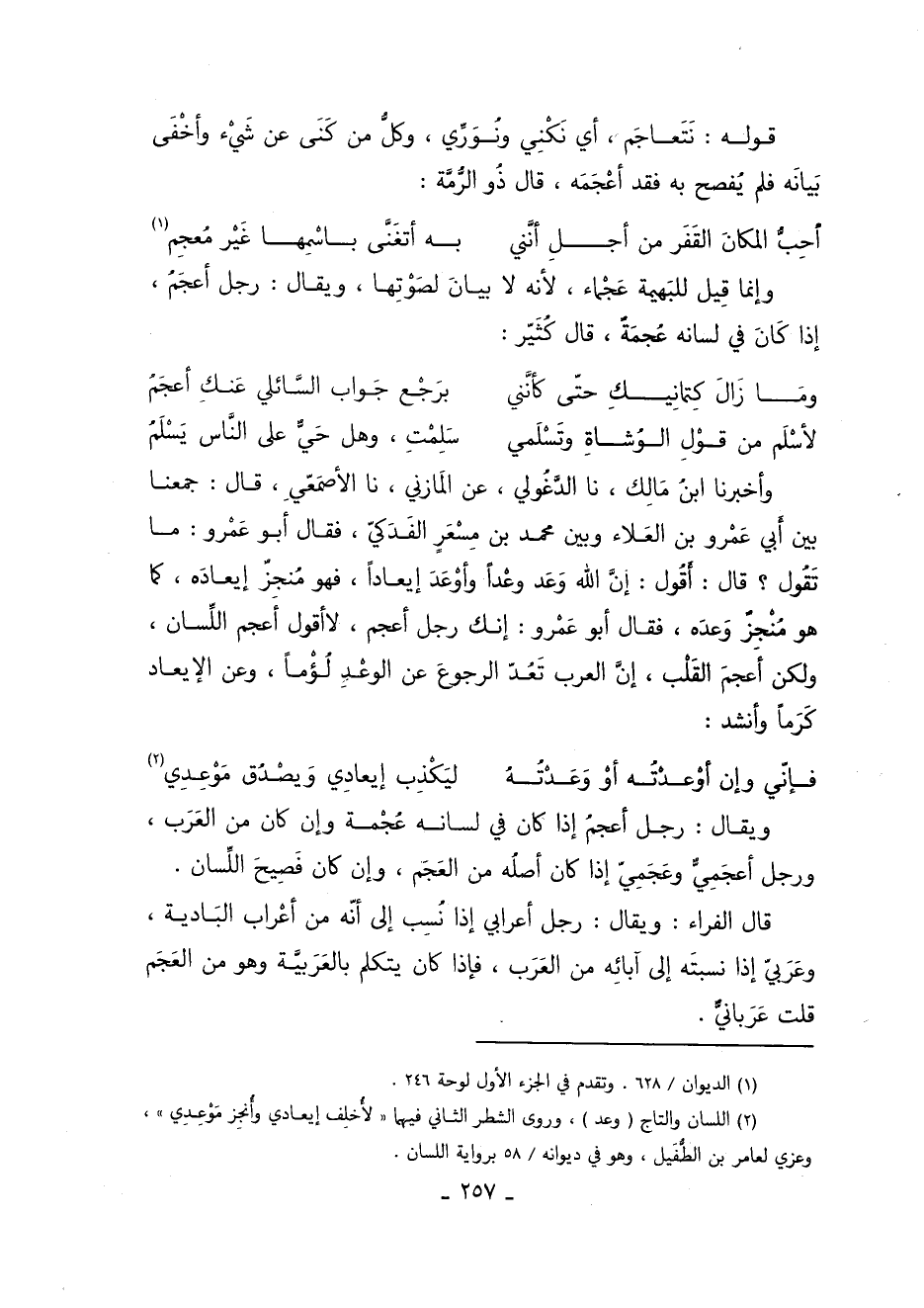 وأخبرنا ابن مالك أخبرنا الدغولي عن المازني أخبرنا الأصمعي قَالَ: جمعنا بين أبي عمرو بن العلاء وبين مُحَمَّد بن مسعر الفدكي فَقَالَ أَبُو عمرو ما تقول قَالَ: أقول إن اللَّه وعد وعدا وأوعد إيعادا فهو منجز إيعاده كما هو منجز وعده فَقَالَ أَبُو عمرو: إنك رجل أعجم لا أقول أعجم اللسان ولكن أعجم القلب إن العرب تعد الرجوع عَنِ الوعد لؤما وعَنِ الإيعاد كرما وأنشد: