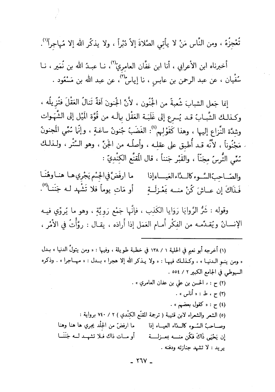 وَقَالَ أَبُو سُلَيْمَانَ فِي حَدِيثِ عبد الله أَنَّهُ كَانَ يَقُولُ فِي خِطْبَتِهِ: الشَّبَابُ شُعْبَةٌ مِنَ الْجُنُونِ وَشَرُّ الرَّوَايَا رَوَايَا الْكَذِبِ وَمَنْ يَنْوِ الدُّنْيَا تُعْجِزُهُ وَمِنَ النَّاسِ مَنْ لا يَأْتِي الصَّلاةَ إِلا دُبْرًا وَلا يَذْكُرُ اللَّهَ إِلا مُهَاجِرًا 1.