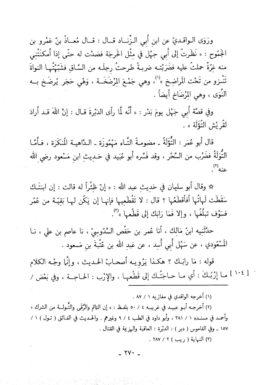 وفي قصة أبي جهل يوم بدر أَنَّهُ لما رأي الدبرة قَالَ أن اللَّه قد أراد لقريش التؤلة.
