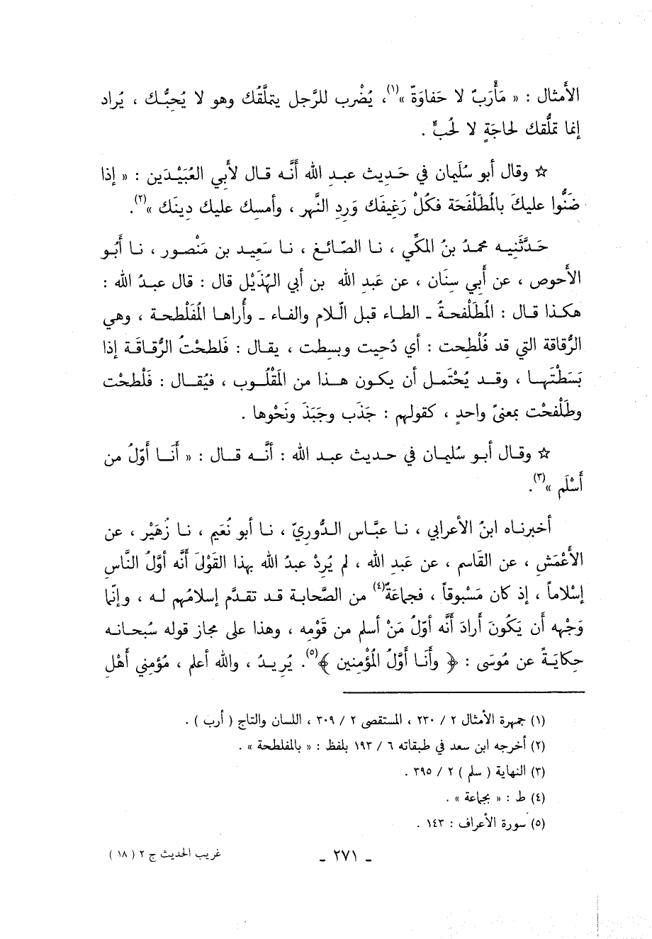 أخبرناه ابن الأعرابي أخبرنا عباس الدوري أخبرنا أبو نعيم أخبرنا زُهَيْرٌ عَنِ الأَعْمَشِ عَنِ الْقَاسِمِ عن عبد الله لم يرد عبد الله بِهَذَا الْقَوْلِ أَنَّهُ أَوَّلُ النَّاسِ إسلاما إذا كَانَ مَسْبُوقًا فَجَمَاعَةٌ 2 مِنَ الصَّحَابَةِ قَدْ تَقَدَّمَ إِسْلامُهُمْ لَهُ وَإِنَّمَا وَجْهُهُ أَنْ يَكُونَ أَرَادَ أَنَّهُ أَوَّلُ مَنْ أَسْلَمَ مِنْ قَوْمِهِ وَهَذَا عَلَى مَجَازِ قَوْلِهِ سُبْحَانَهُ حِكَايَةً عَنْ مُوسَى {وَأَنَا أَوَّلُ الْمُؤْمِنِينَ} 3 يُرِيدُ وَاللَّهُ أَعْلَمُ مُؤْمِنِي أَهْلِ