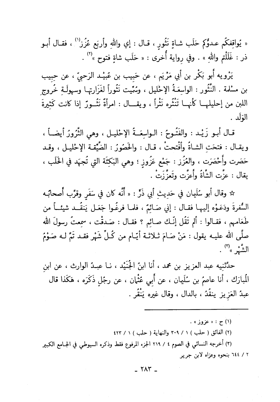 وَقَالَ أَبُو سُلَيْمَانَ فِي حَدِيثِ أَبِي ذَرٍّ أَنَّهُ قَالَ لَحِبيبِ بْنِ مَسْلَمَةَ: يُوَاقفكُمْ عَدُوُّكُمْ حَلَبَ شَاةٍ نَثُورٍ قَالَ أي وَاللَّهِ وَأَرْبَعُ عُزُزٍ 1 فَقَالَ أَبُو ذَرٍّ غَلَلْتُمْ وَاللَّهِ. وفِي رِوَايَةٍ أُخْرَى حَلَبَ شَاةٍ فَتُوحٍ 2.