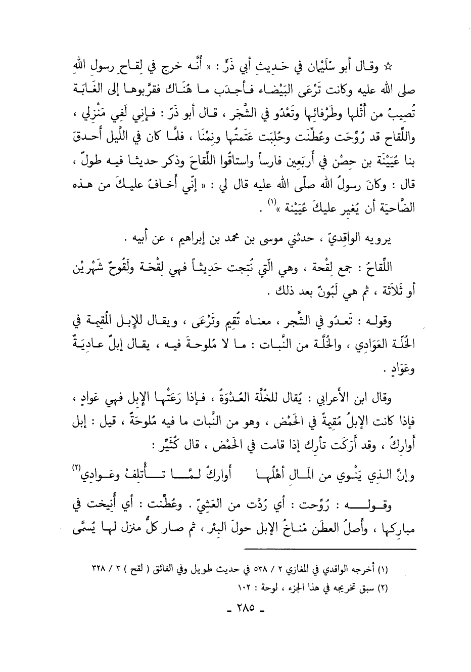 وَقَالَ أَبُو سُلَيْمَانَ فِي حَدِيثِ أَبِي ذَرٍّ أَنَّهُ خَرَجَ فِي لقاح رسول الله وَكَانَتْ تَرْعَى الْبَيْضَاءَ فَأَجْدَبَ مَا هُنَاكَ فَقَرَّبُوهَا إِلَى الْغَابَةِ تُصِيبُ مِنْ أَثْلِهَا وَطَرْفَائِهَا وَتَعْدُو فِي الشَّجَرِ قَالَ أَبُو ذَرٍّ فَإِنِّي لَفِي مَنْزِلِي وَاللِّقَاحُ قَدْ رُوِّحَتْ وَعُطِّنَتْ وَحُلِبَتْ عَتْمَتُهَا وَنِمْنَا فَلَمَّا كَانَ فِي اللَّيْلِ أَحْدَقَ بِنَا عُيَيْنَةُ بْنُ حِصْنٍ فِي أَرْبَعِينَ فَارِسًا وَاسْتَاقُوا اللِّقَاحَ وَذَكَرَ حَدِيثًا فِيه طُولٍ قَالَ وَكَانَ رَسُولُ الله قال لي "إي أخاف عليك من هَذَهِ الضَّاحِيَةِ أَنْ يَغِيرَ عَلَيْكَ عيينة" 1