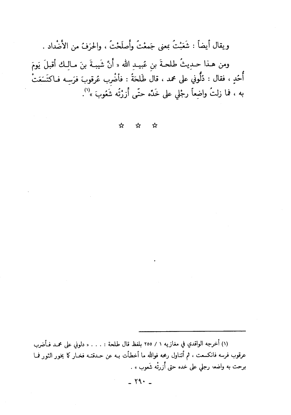 1 أخرجه الواقدي في مغازيه "1/ 255" بلفظ قال طلحة: "دلوني على محمد فأضرب عرقوب فرسه فانكسعت ثم أتناول رمحه فوالله ما أخطأت به عن حدقته فخار كما يخور الثور فما برحت به واضعا رجلي أَزَرْتُهُ شَعُوبَ".