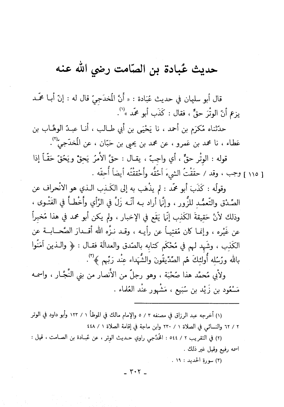 قَالَ أَبُو سُلَيْمَانَ فِي حَدِيثِ عُبَادَةَ أَنَّ الْمَخْدَجِيَّ قَالَ لَهُ: إِنَّ أَبَا مُحَمَّدٍ يَزْعُمُ أَنَّ الْوِتْرَ حَقٌّ فَقَالَ: كَذَبَ أَبُو مُحَمَّدٍ 1.