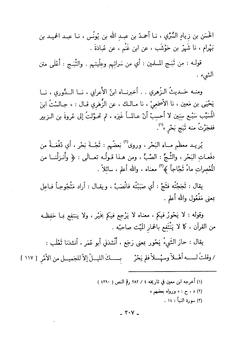 أَخْبَرَنَاهُ ابْنُ الأعرابي أخبرنا الدوري أخبرنا يحيى بن معين أخبرنا الأصمعي أخبرنا مالك عَنِ الزهري قَالَ جالست ابن المسيب سبع سنين لا أحسب أن عالما غيره ثم تحولت إلى عروة بن الزبير ففجرت منه ثبج بحر 1.