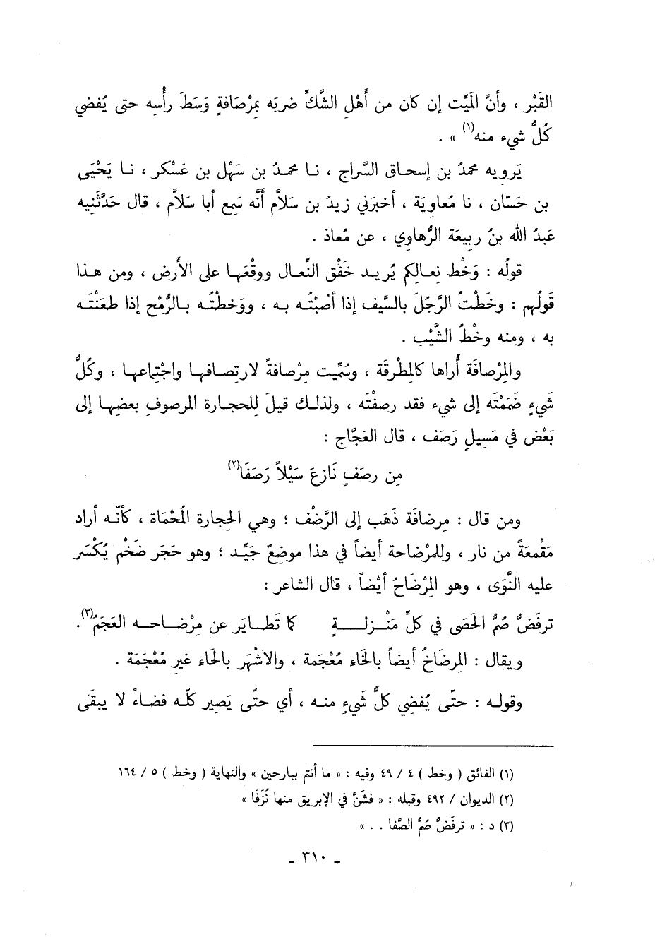 ومن قَالَ مرضافة ذهب إلى الرضف وهى الحجارة المحماة كأنه أراد مقمعة من نار وللمرضاحة أيضا في هذا موضع جيد وهو حجر ضخم يكسر عليه النوى وهو المرضاخ أيضا قَالَ الشاعر: