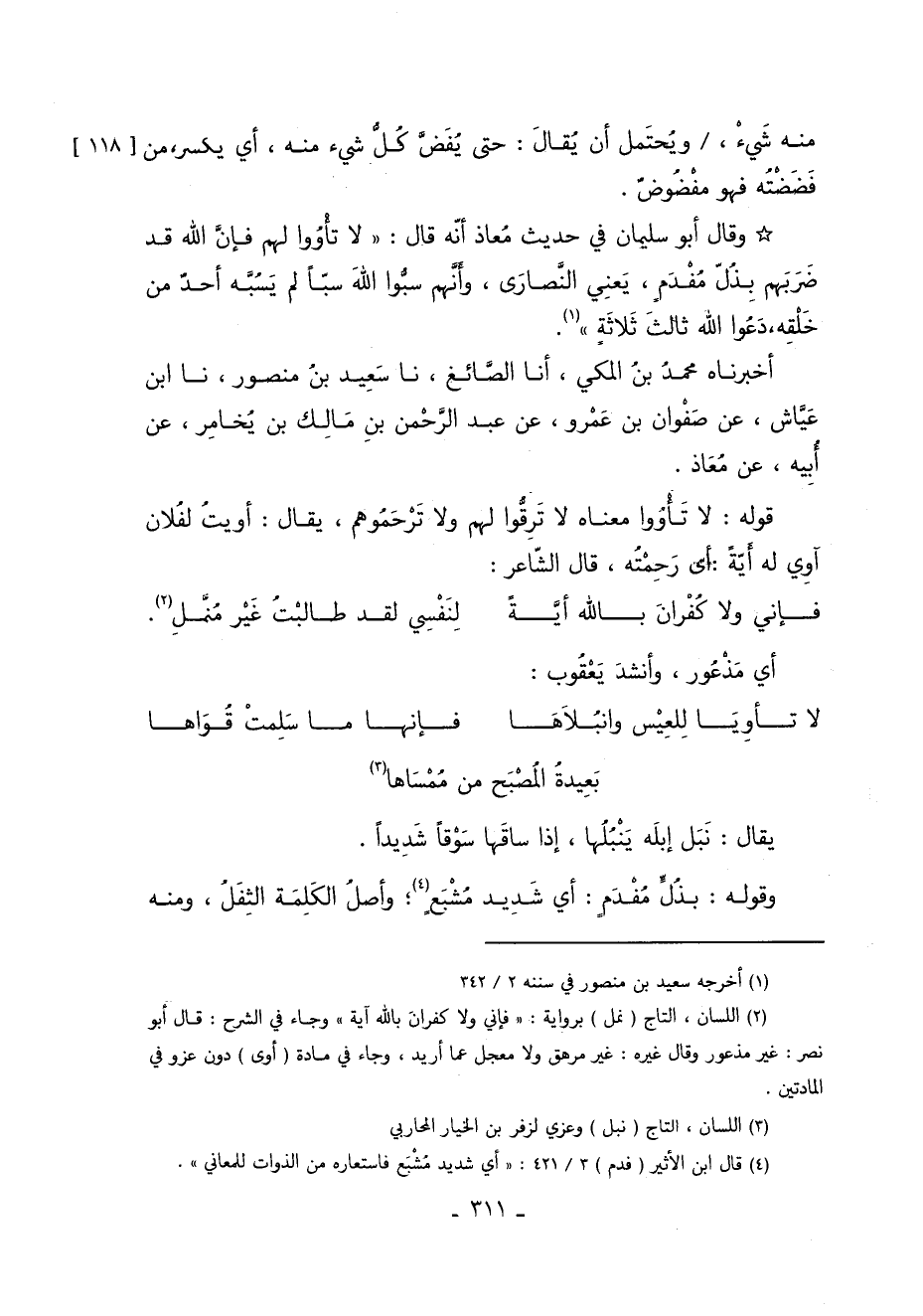 وَقَوْلُهُ: بذل مفدم أي شديد مشبع 4 وأصل الكلمة الثفل ومنه قولهم: رجل فدم: أي ثقيل وصبغ مفدم أي مشبع ومعناه الخاثر المثقل ومن هذا قيل للعيي الفدم وقد فدم فدامة إذا ثقل لسانه وأبطأ بيانه.