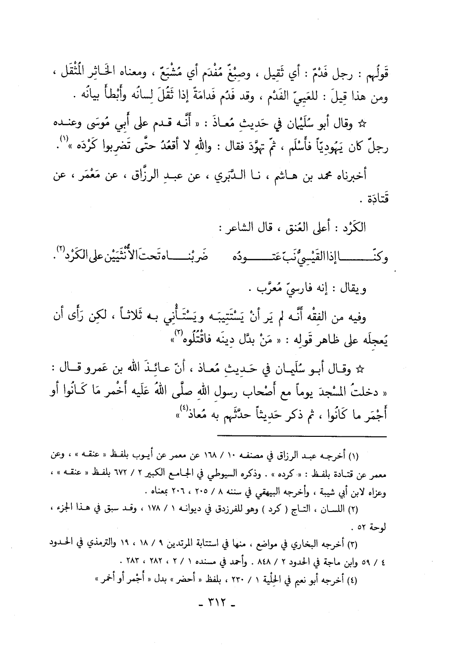 وَقَالَ أَبُو سُلَيْمَانَ فِي حَدِيثِ مُعَاذٍ أَنَّهُ: قَدِمَ عَلَى أَبِي مُوسَى وَعِنْدَهُ رَجُلٌ كَانَ يَهُودِيًّا فَأَسْلَمَ ثُمَّ تَهَوَّدَ فَقَالَ وَاللَّهِ لا أَقْعُدُ حَتَّى تَضْرِبُوا كَرْدَهُ 1.
