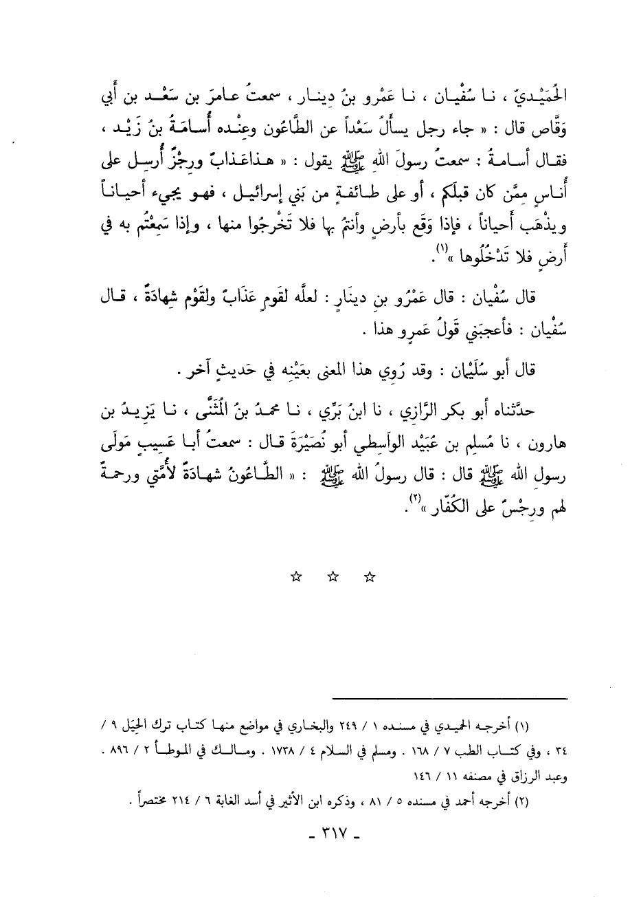 الحميدي أخبرنا سُفْيَانُ نا عَمْرُو بْنُ دِينَارٍ سَمِعْتُ عَامِرَ بْنَ سَعْدِ بْنِ أَبِي وَقَّاصٍ قَالَ جَاءَ رَجُلٌ يَسْأَلُ سَعْدًا عَنِ الطَّاعُونِ وَعِنْدَهُ أُسَامَةُ بْنُ زَيْدٍ فَقَالَ أُسَامَةُ سَمِعْتُ رَسُولَ اللَّهِ صَلَّى اللَّهُ عَلَيْهِ وَسَلَّمَ يَقُولُ: "هَذَا عَذَابٌ وَرِجْزٌ أُرِسْلَ عَلَى أُنَاسٍ مِمَّنْ كَانَ قَبْلَكُمْ أَوْ عَلَى طَائِفَةٍ مِنْ بَنِي إِسْرَائِيلَ فَهُوَ يَجِيءُ أَحْيَانًا وَيَذْهَبُ أَحْيَانًا فَإِذَا وَقَعَ بِأَرْضٍ وَأَنْتُمْ بِهَا فَلا تَخْرُجُوا مِنْهَا وَإِذَا سَمِعْتُمْ بِهِ فِي أَرْضٍ فَلا تَدْخُلُوهَا" 1.