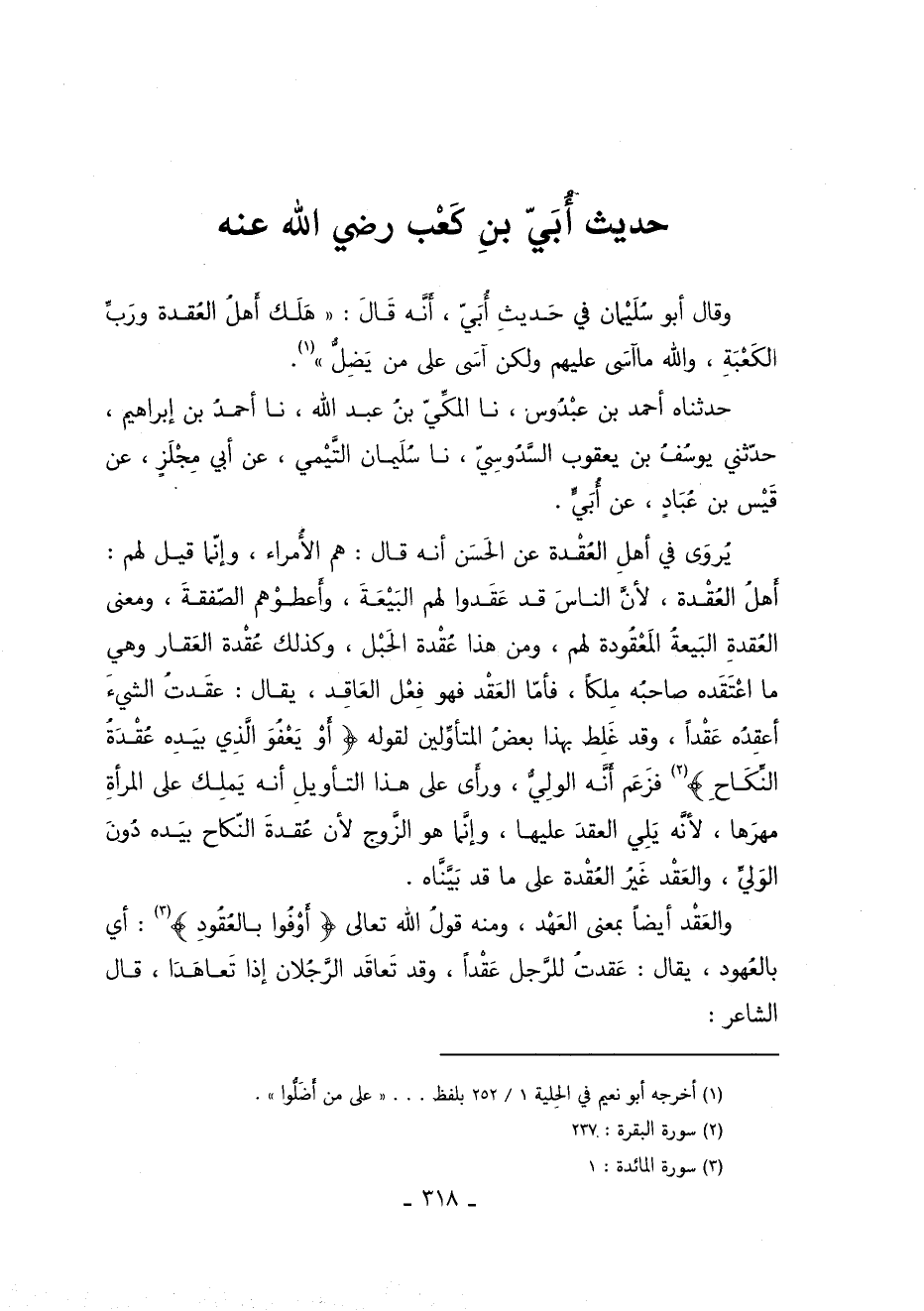 وَقَالَ أَبُو سُلَيْمَانَ فِي حَدِيثِ أُبِيٍّ أَنَّهُ قَالَ: هَلَكَ أَهْلُ الْعُقْدَةِ وَرَبِّ الْكَعْبَةِ وَاللَّهِ مَا آسَى عَلَيْهِمْ وَلَكِنْ آسَى عَلَى مَنْ يَضِلُّ 1.