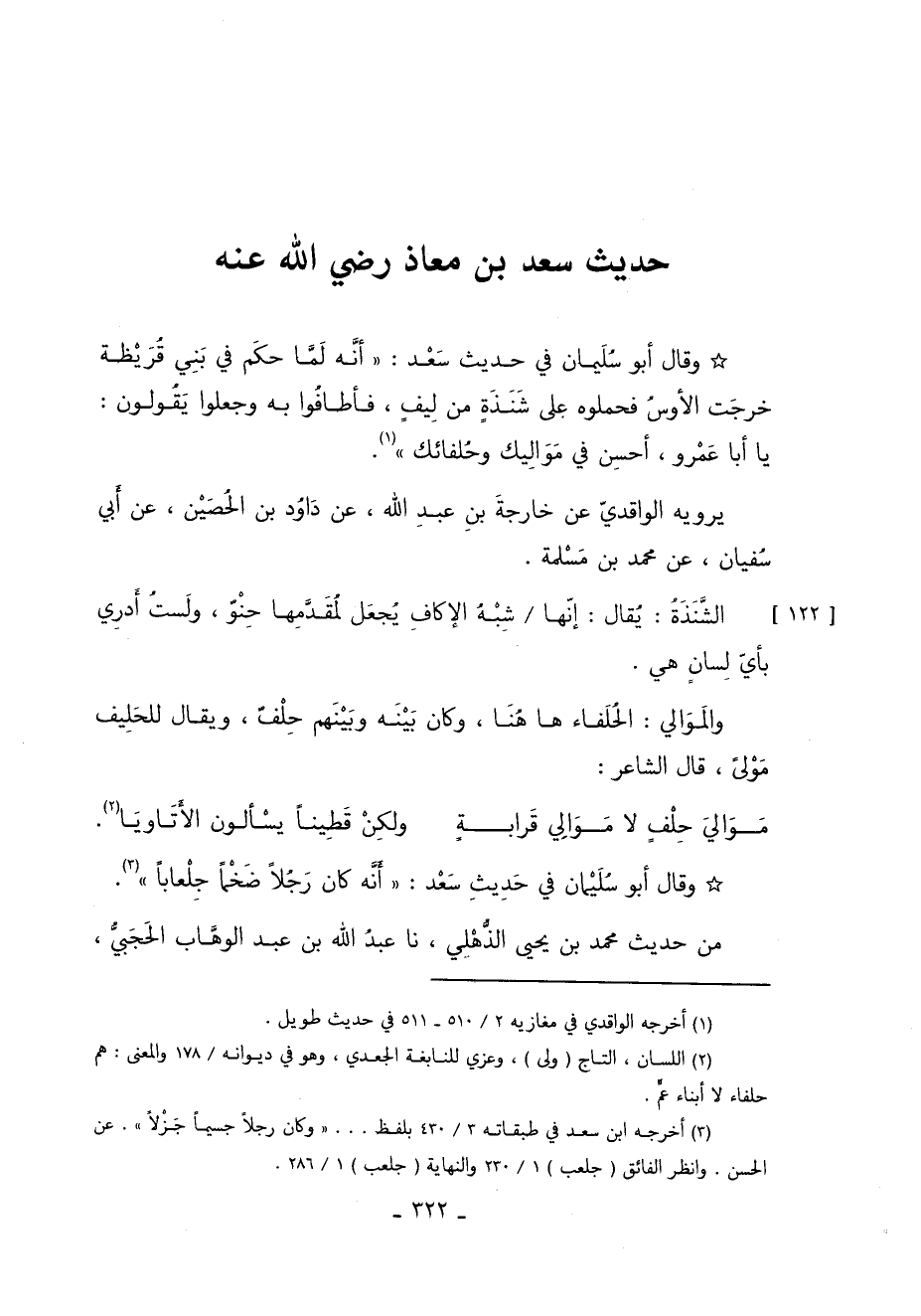 وَقَالَ أَبُو سُلَيْمَانَ فِي حَدِيثِ سَعْدٍ أَنَّهُ: لَمَّا حَكَمَ فِي بَنِي قُرَيْظَةَ خَرَجَتِ الأَوْسُ فَحَمَلُوهُ عَلَى شَنَذَةٍ مِنْ لِيفٍ فَأَطَافُوا بِهِ وَجَعَلُوا يَقُولُونَ يَا أَبَا عَمْرٍو أَحْسِنْ فِي مَوَالِيكَ وَحُلَفَائِكَ 1.