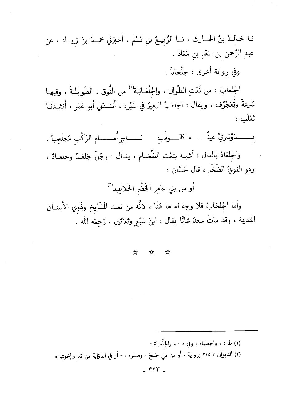 وأما الجلحاب فلا وجه له هاهنا لأنه من نعت المشايخ وذوي الأسنان القديمة وقد مات سعد شابا يُقَالُ ابن سبع وثلاثين رحمه الله.