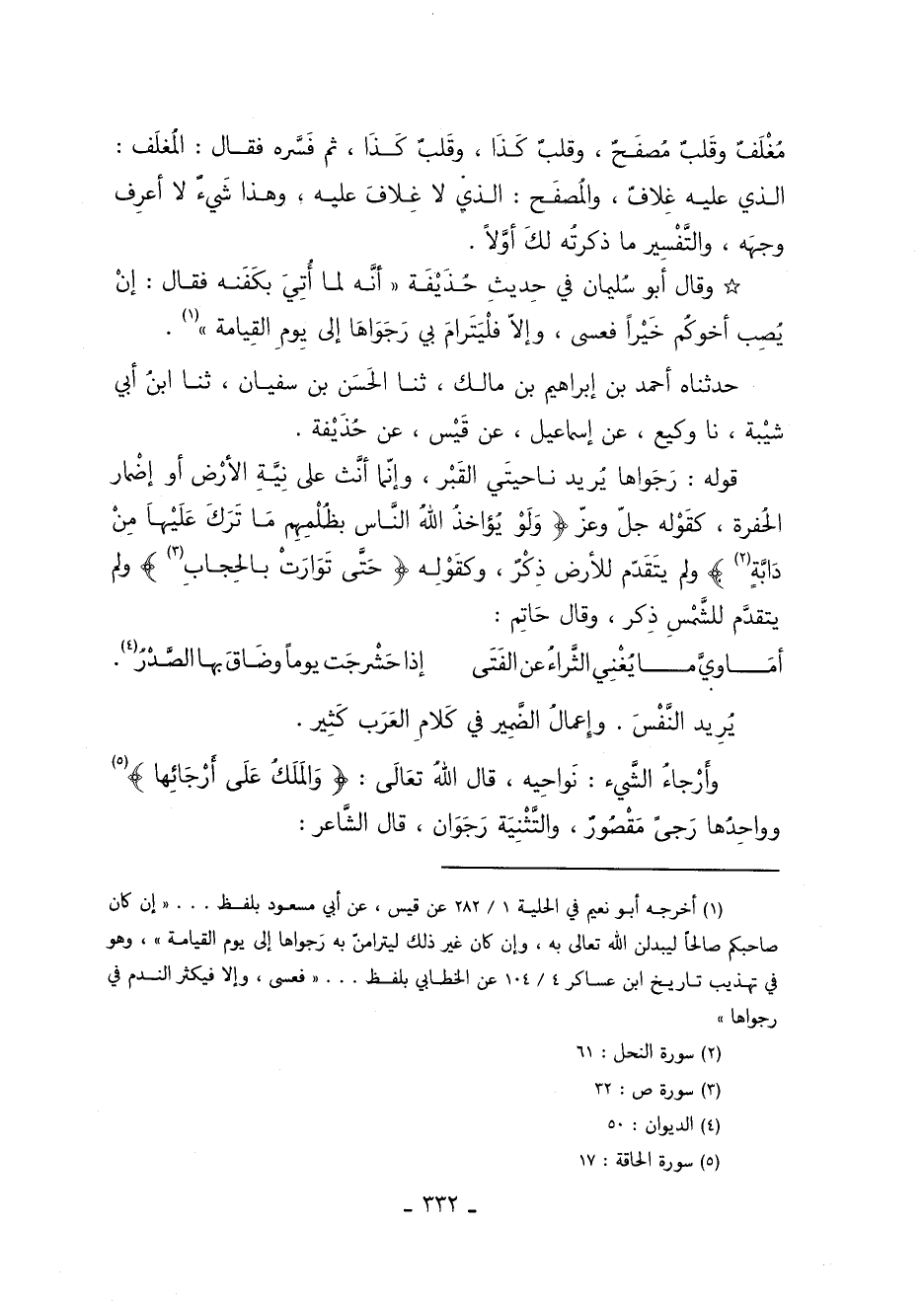 قوله: رجواها يريد ناحيتي القبر وإنما أنث على نية الأرض أو إضمار الحفرة كقوله جل وعز: {وَلَوْ يُؤَاخِذُ اللَّهُ النَّاسَ بِظُلْمِهِمْ مَا تَرَكَ عَلَيْهَا مِنْ دَابَّةٍ} 2 ولم يتقدم للأرض ذكر وكقوله: {حَتَّى تَوَارَتْ بِالْحِجَابِ} 3 ولم يتقدم للشمس ذكر وَقَالَ حاتم: وَقَالَ أَبُو سُلَيْمَانَ فِي حَدِيثِ حُذَيْفَةَ أَنَّهُ: لَمَّا أُتِيَ بِكَفَنِهِ فَقَالَ إِنْ يُصِبْ أَخُوكُمْ خَيْرًا فَعَسَى وَإِلا فَلْيَتَرَامَ بِي رَجْوَاهَا إِلَى يَوْمِ الْقِيَامَةِ 1.
