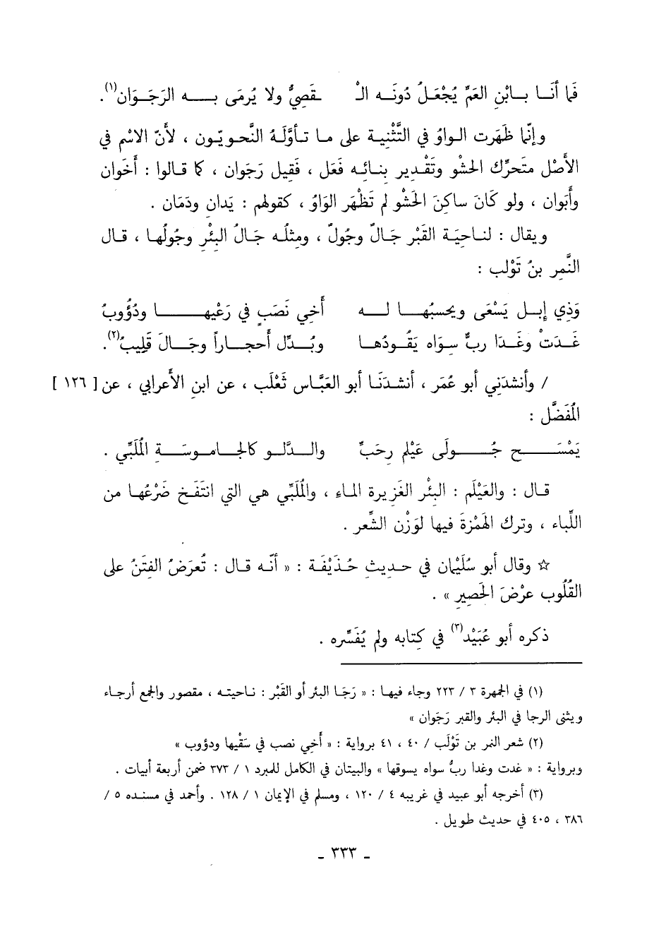 / وأنشدني أَبُو عُمَر أنشدنا أبو العبّاس ثَعْلَب عن ابن الأعرابي عَنِ المفضل: [126]