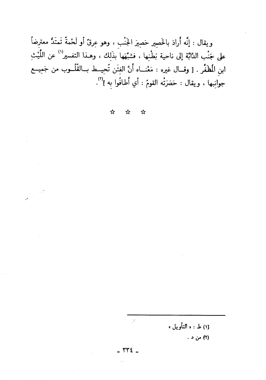 ويقال أَنَّهُ أراد بالحصير حصير الجنب وهو عرق أو لحمه تمتد معترضا على جنب الدابة إلى ناحية بطنها فشبهها بذلك وهذا التفسير 1 عَنِ الليث ابن المظفر. وَقَالَ غيره معناه أن الفتن تحيط بالقلوب من جميع جوانبها ويقال حصرته القوم أي أطافوا به 2.