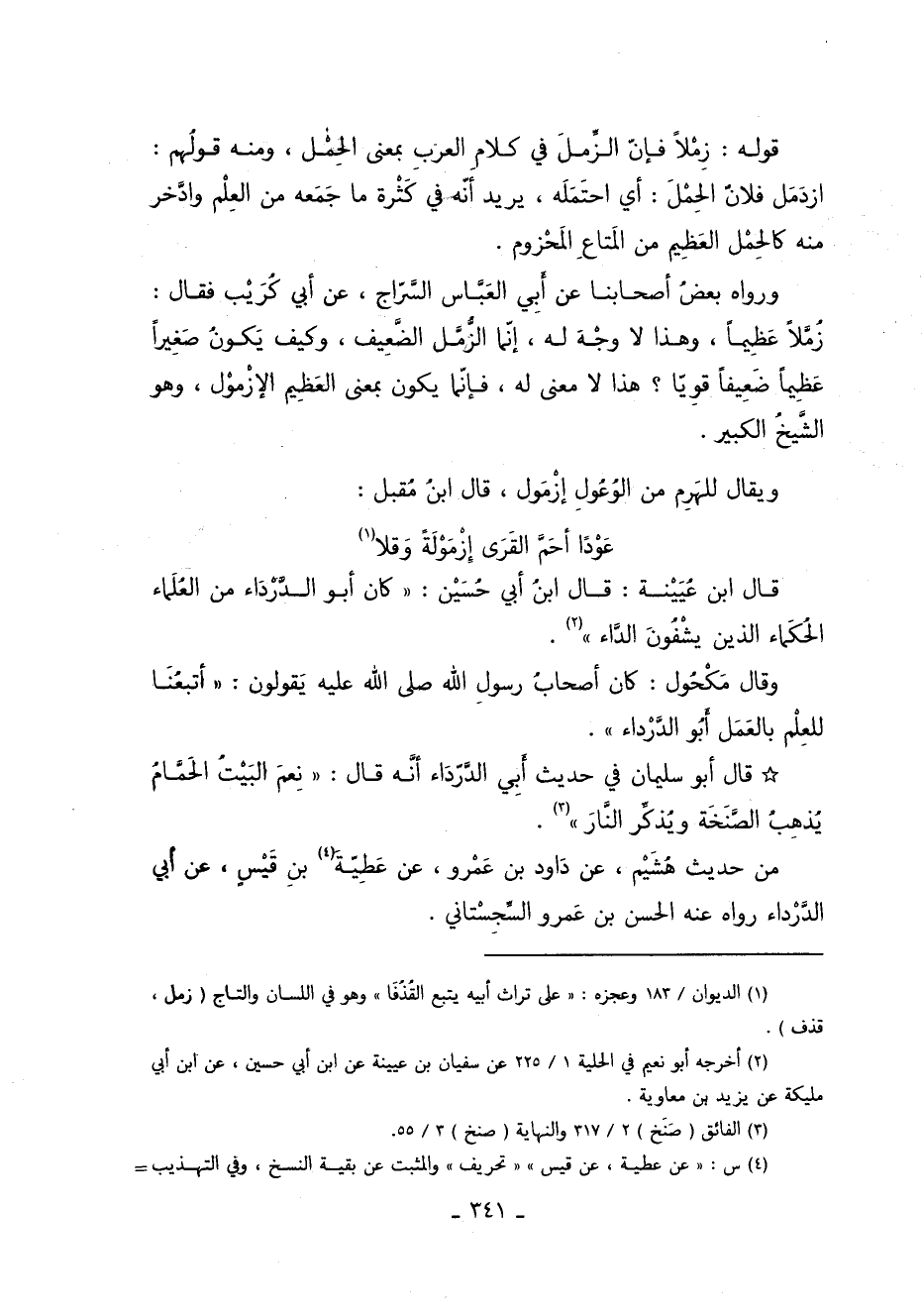 ورواه بعض أصحابنا عَنْ أَبِي العباس السراج عَنْ أَبِي كريب فَقَالَ زملا عظيما وهذا لا وجه له إنما الزمل الضعيف وكيف يكون صغيرا عظيما ضعيفا قويا هذا لا معنى له فإنما يكون بمعنى العظيم الإزمول وهو الشيخ الكبير.