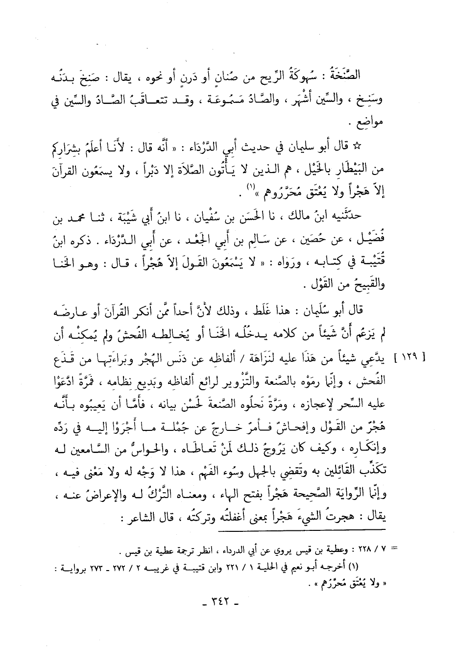 حدثنيه ابن مالك أخبرنا الحسن بن سفيان أخبرنا ابن أبي شيبة حدثنا مُحَمَّدُ بْنُ فُضَيْلٍ عَنْ حُصَيْنٍ عَنْ سَالِمِ بْنِ أَبِي الْجَعْدِ عَنْ أَبِي الدَّرْدَاءِ. ذَكَرَهُ ابْنُ قُتَيْبَةَ فِي كِتَابٍه وَرَوَاهُ: لا يسمعون القول إِلا هَجْرًا قَالَ: وَهُوَ الْخَنَا وَالْقَبِيحُ مِنَ الْقَوْلِ.