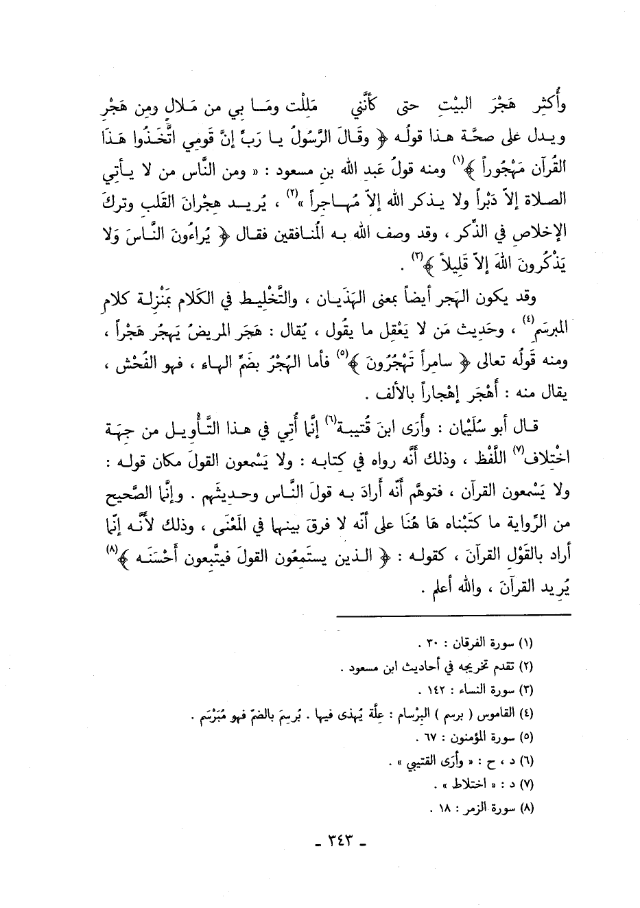 وأكثر هجر البيت حتى كأنني مللت وما بي من ملال ومن هجر وَيَدُّلُ عَلَى صِحَّةِ هَذَا قَوْلُهُ: {وَقَالَ الرَّسُولُ يَا رَبِّ إِنَّ قَوْمِي اتَّخَذُوا هَذَا الْقُرْآنَ مَهْجُوراً} 1 ومنه قول عبد الله بْنُ مَسْعُودٍ وَمِنَ النَّاسِ مَنْ لا يَأْتِي الصَّلاةَ إِلا دُبْرًا وَلا يَذْكُرُ اللَّهَ إِلا مُهَاجِرًا 2 يُرِيدُ هُجْرَانَ الْقَلْبِ وَتَرْكَ الإِخْلاصِ فِي الذِّكْرِ وَقَدْ وَصَفَ اللَّهُ به المنافقين فقال {يُرَاؤُونَ النَّاسَ وَلا يَذْكُرُونَ اللَّهَ إِلَّا قَلِيلاً} 3.