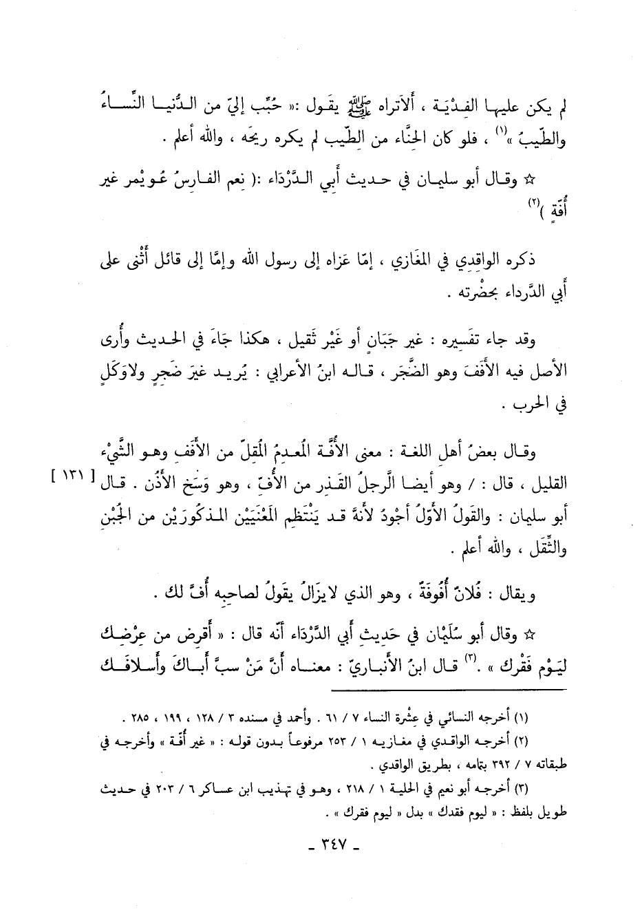 وَقَالَ أَبُو سُلَيْمَانَ فِي حَدِيثِ أبي الدرداء: نعم الفارس عويمر غير أفة 1.