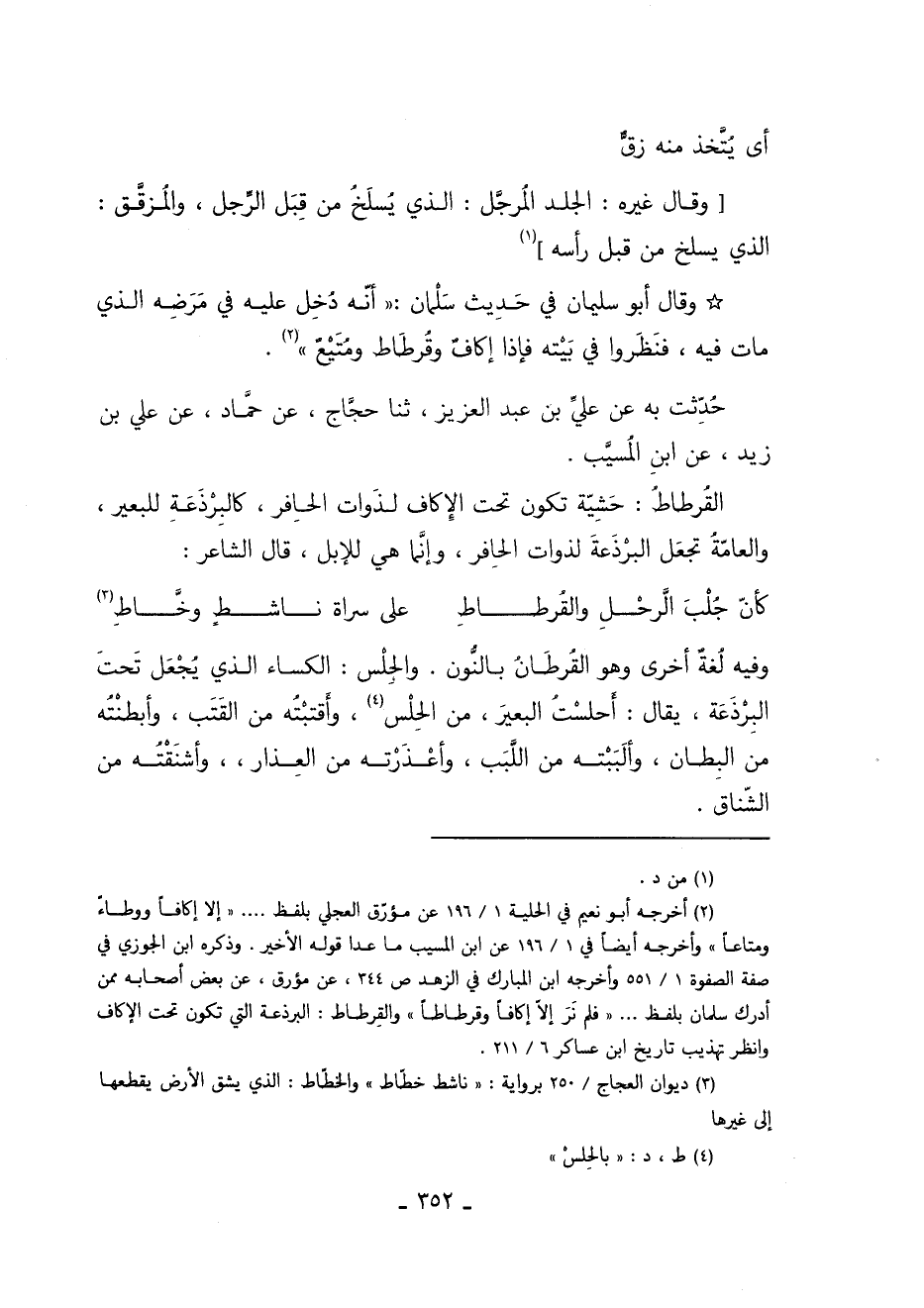 وقَالَ غيره الجلد المرجل الَّذِي يسلخ من قبل الرجل والمزقق الَّذِي يسلخ من قبل رأسه 1.