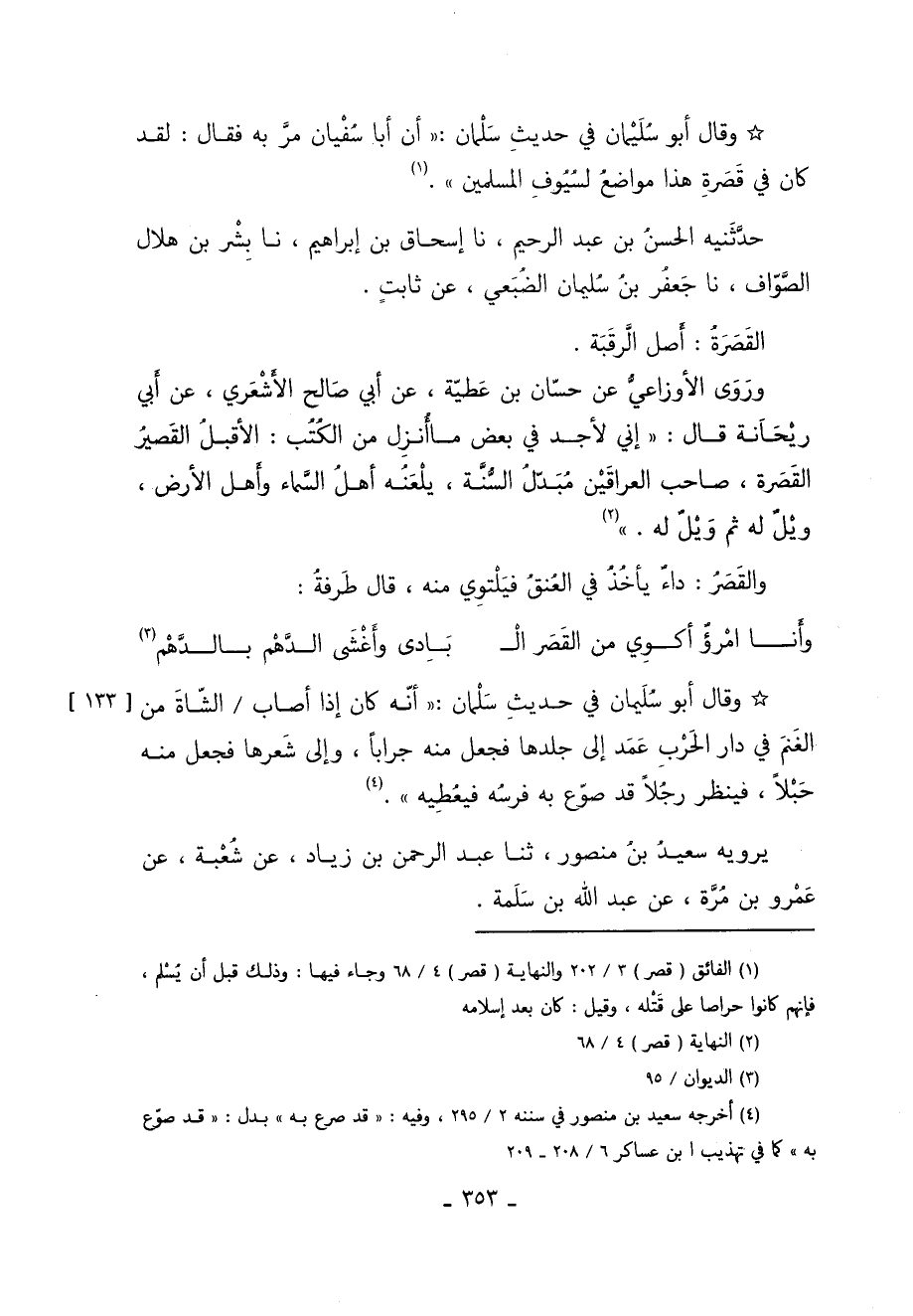 وَقَالَ أَبُو سُلَيْمَانَ فِي حَدِيثِ سَلْمَانَ أَنَّ أَبَا سُفْيَانَ مَرَّ بِهِ فَقَالَ: لَقَدْ كَانَ فِي قَصَرَةِ هَذَا مَوَاضِعٌ لِسُيُوفِ الْمُسْلِمِينَ 1.
