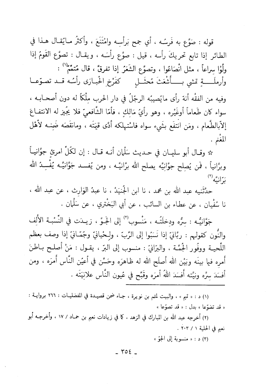 جوانيه سره ودخلته منسوب 2 إلى الجو زيدت في النسبة الألف والنون كقولهم رباني إذا نسبوا إلى الرب ولحياني وجماني إذا وصف بعظم اللحية ووفور الجمة والبراني منسوب إلى البر يقول من أصلح باطن أمره فيما بينه وبين اللَّه أصلح اللَّه له ظاهره وحسن في أعين الناس أمره ومن أفسد سره ونيته أفسد اللَّه أمره وقبح في عيون الناس علانيته