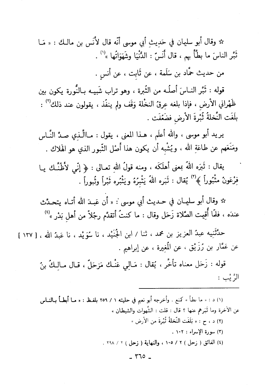 وَقَالَ أَبُو سُلَيْمَانَ فِي حَدِيثِ أَبِي مُوسَي أَنَّهُ قَالَ لأَنَسِ بْنِ مَالِكٍ: مَا ثَبَّرَ النَّاسَ مَا بَطَّأَ بِهِمْ قَالَ أَنَسٌ: الدُّنْيَا وَشَهَوَاتُهَا 1.