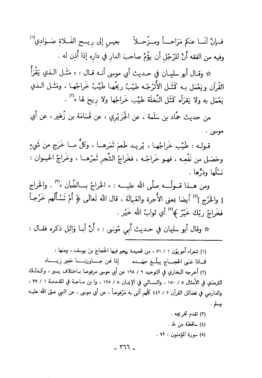 وَمِنْ هَذَا قَوْلُهُ صَلَّى اللَّهُ عَلَيْهِ وَسَلَّمَ: "الْخَرَاجُ بِالضَّمَانِ" 2. وَالخراج والخرج 3 أيضا بمعنى الأجرة والعمالة قَالَ اللَّه تعالى: {أَمْ تَسْأَلُهُمْ خَرْجاً فَخَرَاجُ رَبِّكَ خَيْرٌ} 4 أي ثواب الله خير.