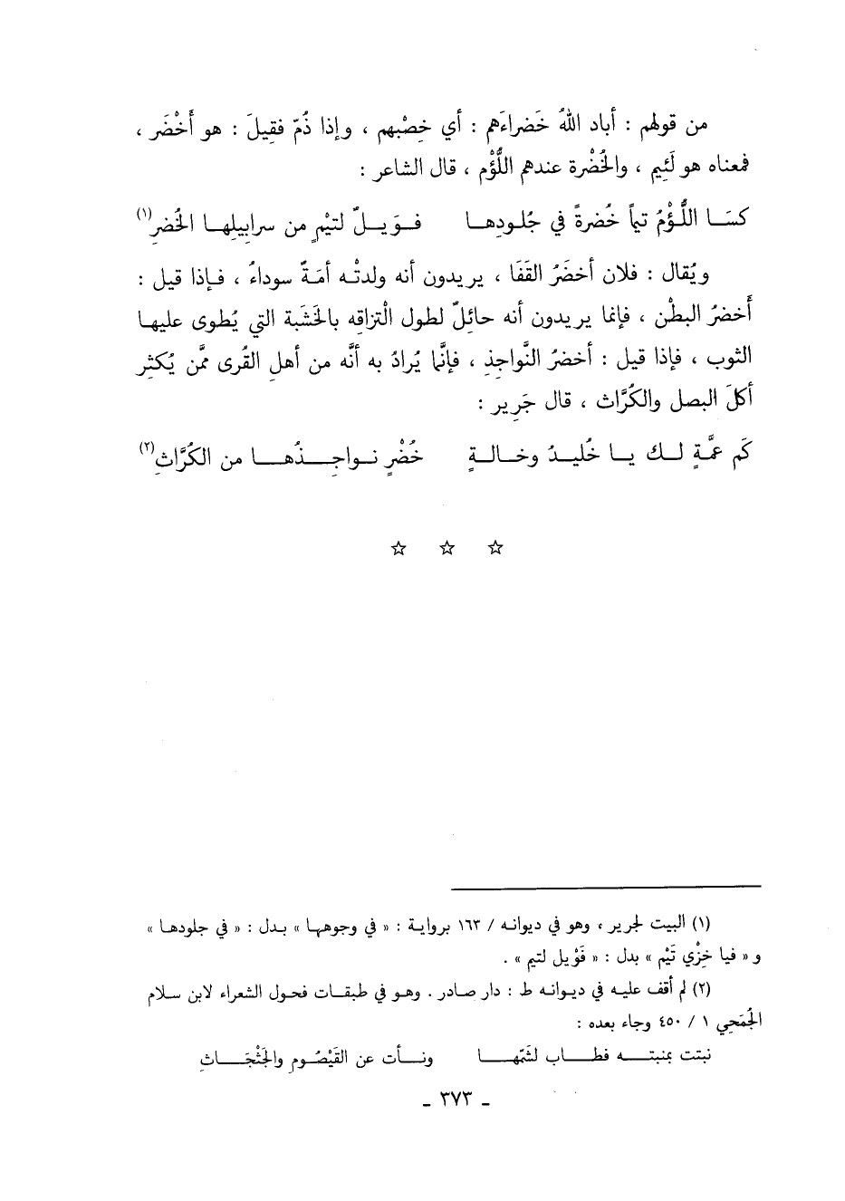 1 البيت لجرير وهو في ديوانه "163" برواية "في وجوهها" بدل "في جلودها" و"فيا خزي تيم" بدل "فويل لتيم".