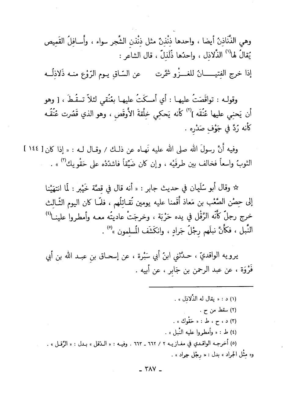 وَقَالَ أَبُو سُلَيْمَانَ فِي حَدِيثِ جَابِرٍ أَنَّهُ قَالَ: فِي قِصَّةِ خَيْبَرٍ لَمَّا انْتَهَيْنَا إِلَى حِصْنِ الصَّعْبِ بْنِ مُعَاذٍ أَقَمْنَا عَلَيْهِ يَوْمَيْنِ نُقَاتِلُهُمْ فَلَمَّا كَانَ الْيَوْمُ الثَّالِثُ خَرَجَ رَجُلٌ كَأَنَّهُ الرَّقْلُ فِي يَدِهِ حَرْبَةٌ وَخَرَجَتْ عَادِيَتُهُ مَعَهُ وَأَمْطَرُوا عَلَيْنَا 1 النَّبْلَ فَكَأَنَّ نَبْلَهُمْ رِجْلُ جَرَادٍ وَانْكَشَفَ الْمُسْلِمُونَ 2.