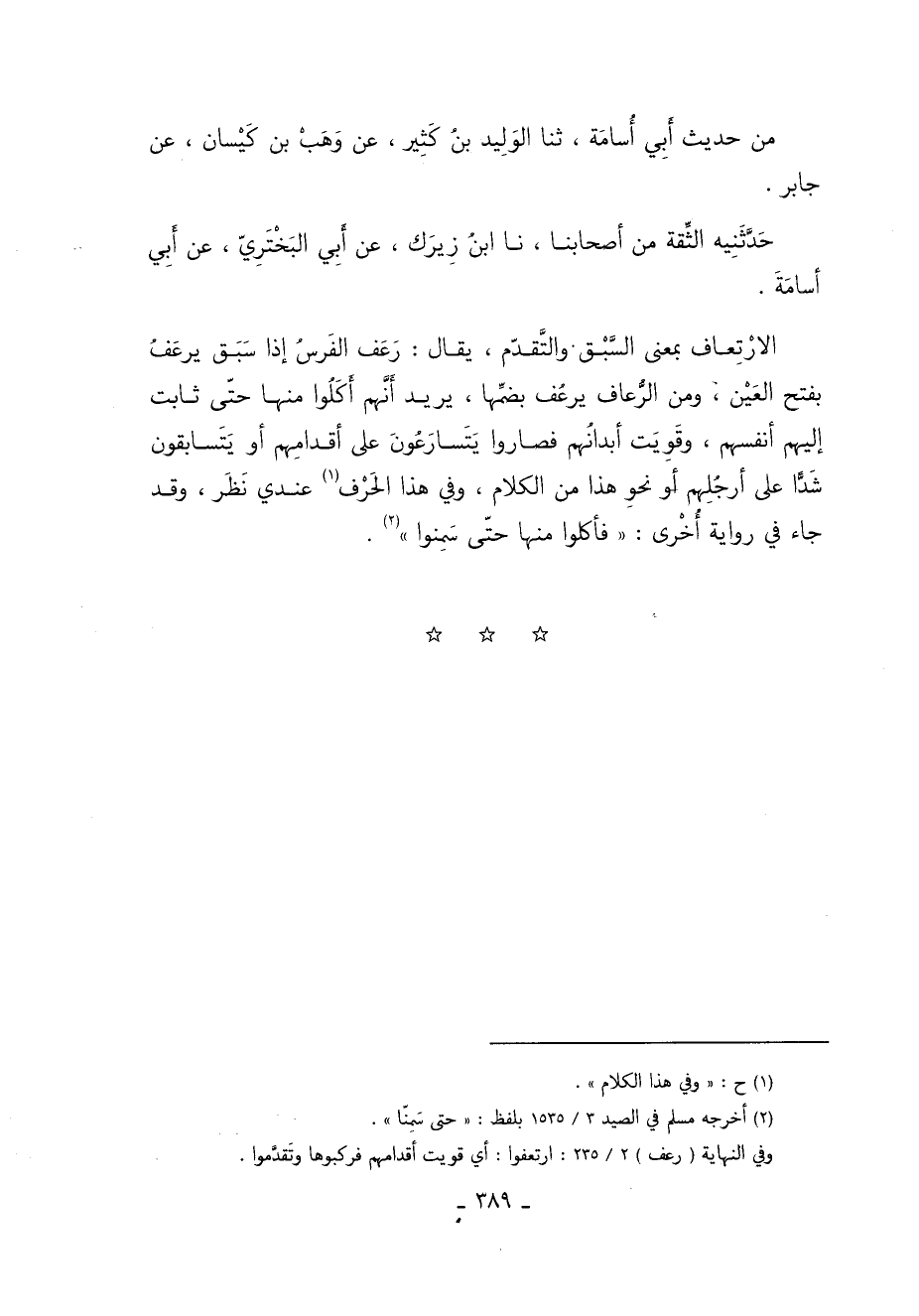 الارتعاف بمعنى السبق والتقدم يُقَالُ: رعف الفرس إذا سبق يرعف بفتح العين ومن الرعاف يرعف بضمها يريد أنهم أكلوا منها حتى ثابت إليهم أنفسهم وقويت أبدانهم فصاروا يتسارعون على أقدامهم أو يتسابقون شدا على أرجلهم أو نحو هذا من الكلام وفي هذا الحرف 1 عندي نظر وقد جاء في رواية أخرى: "فأكلوا منها حتى سمنوا"2.