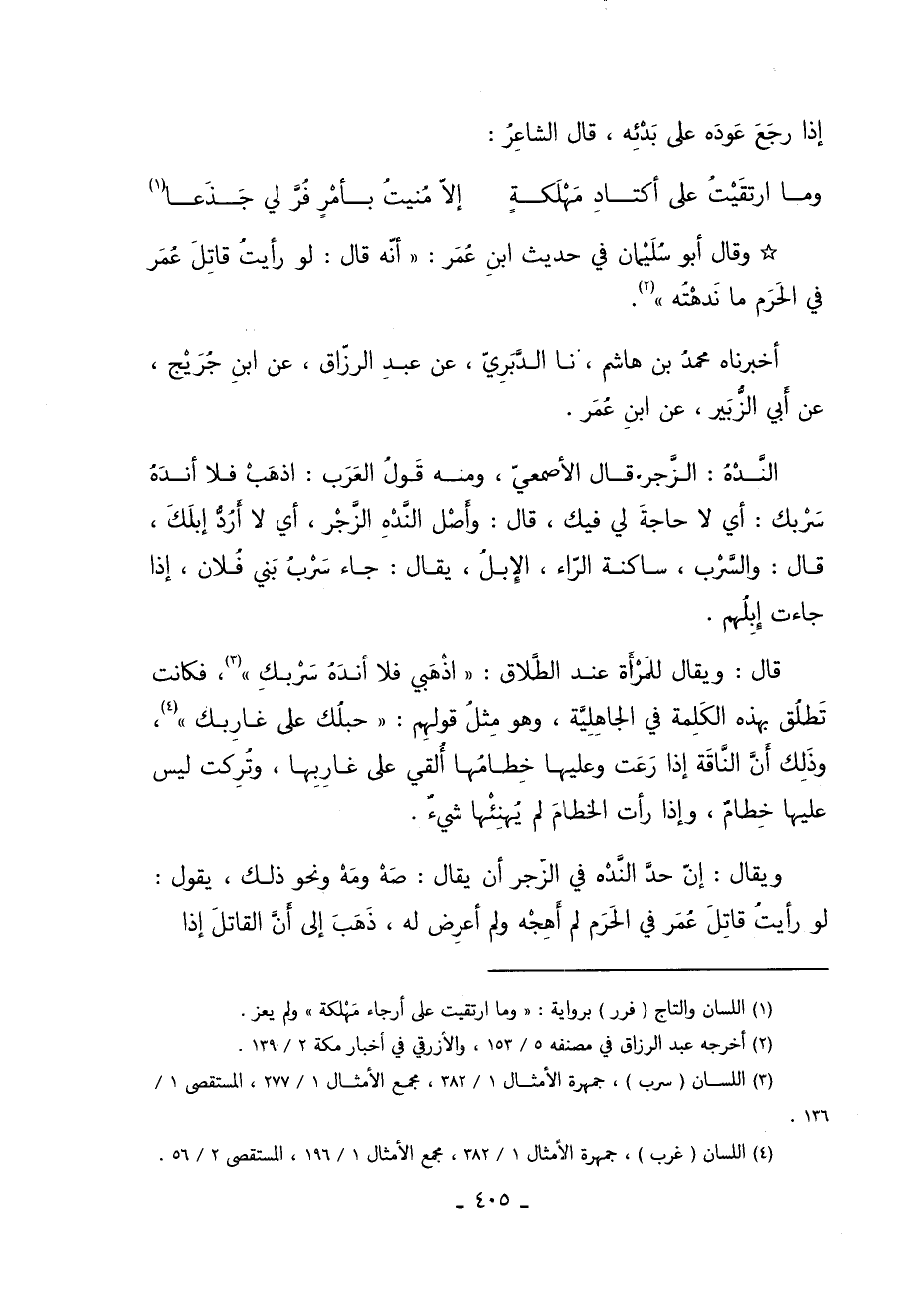 ويقال: إن حد النده في الزجر أن يُقَالُ صه ومه ونحو ذلك يقول لَوْ رَأَيْتُ قَاتِلَ عُمَرَ فِي الحرم لم أهجه ولم أعرض له ذهب إلى أن القاتل إذا