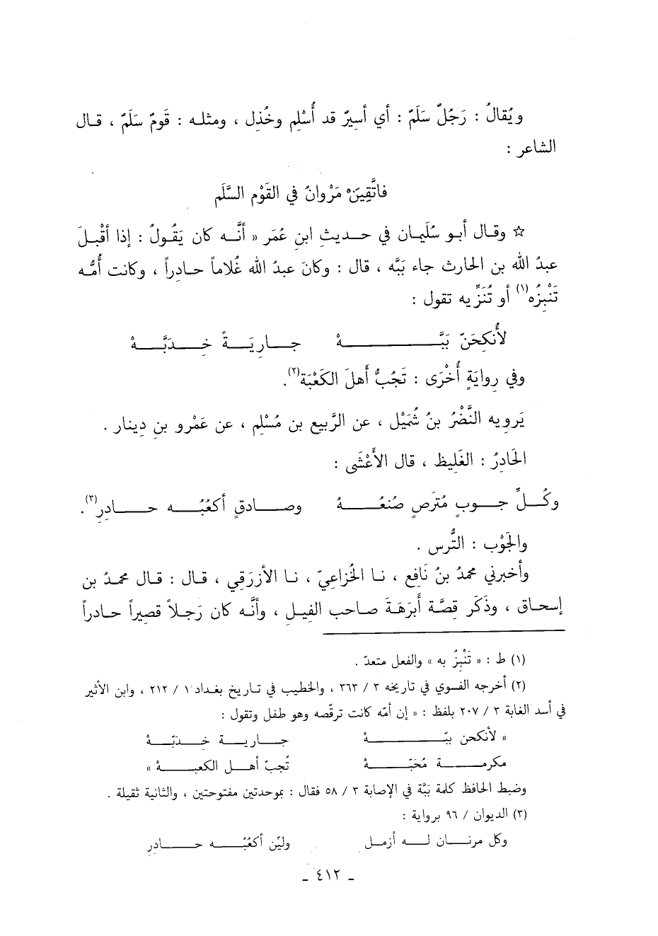 وَقَالَ أَبُو سُلَيْمَانَ فِي حَدِيثِ ابْنِ عُمَرَ أَنَّهُ كَانَ يَقُولُ: إذا أقبل عبد الله بْنُ الْحَارِثِ جَاءَ بَبَّهُ قَالَ وكان عبد الله غُلامًا حَادِرًا وَكَانَتْ أُمُّهُ تَنْبِزُهُ أَوْ تُنَزِيهِ 1 تَقُولُ: