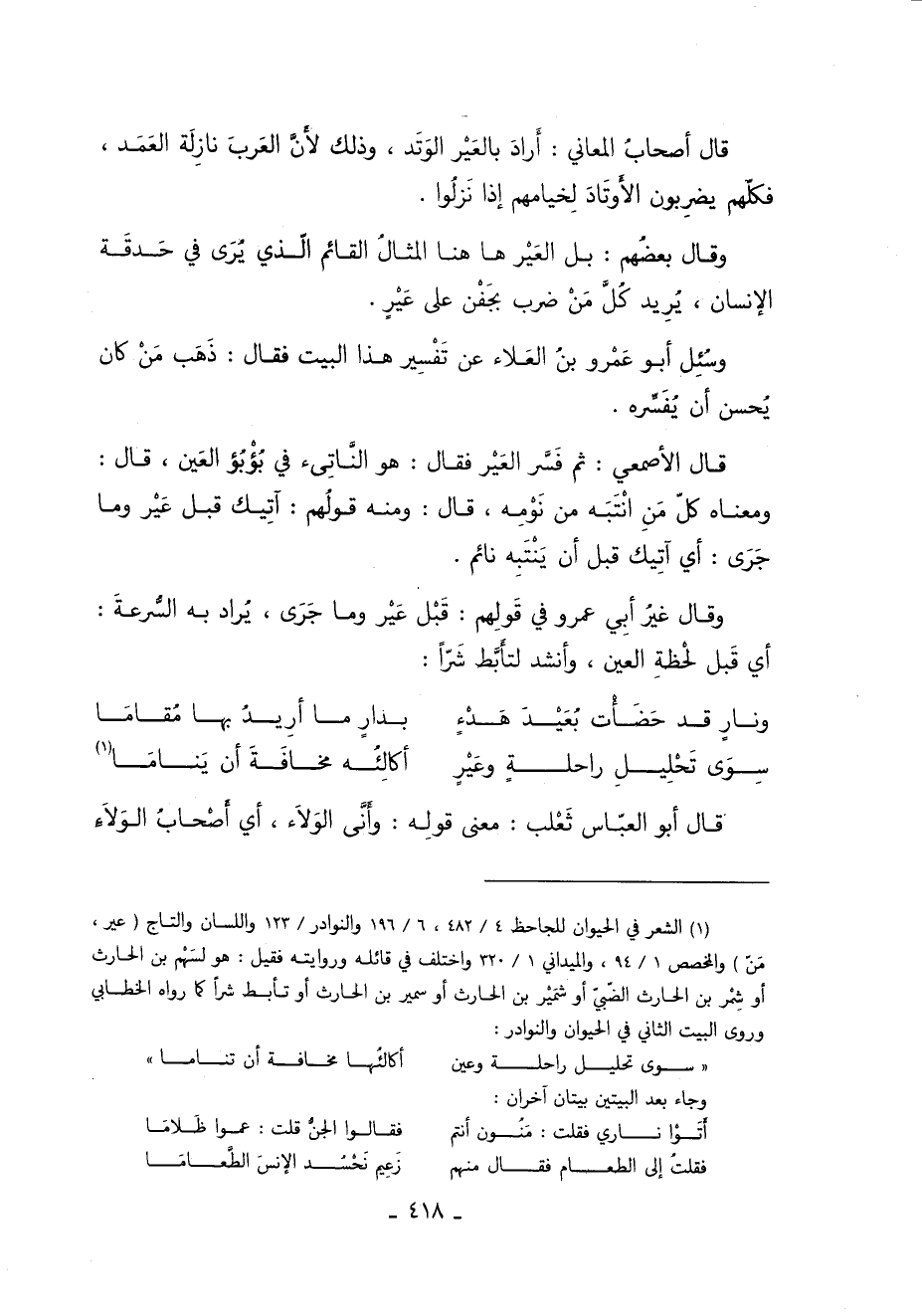 قَالَ أصحاب المعاني: أراد بالعير الوتد وذلك لأن العرب نازلة العمد فكلهم يضربون الأوتاد لخيامهم إذا نزلوا.