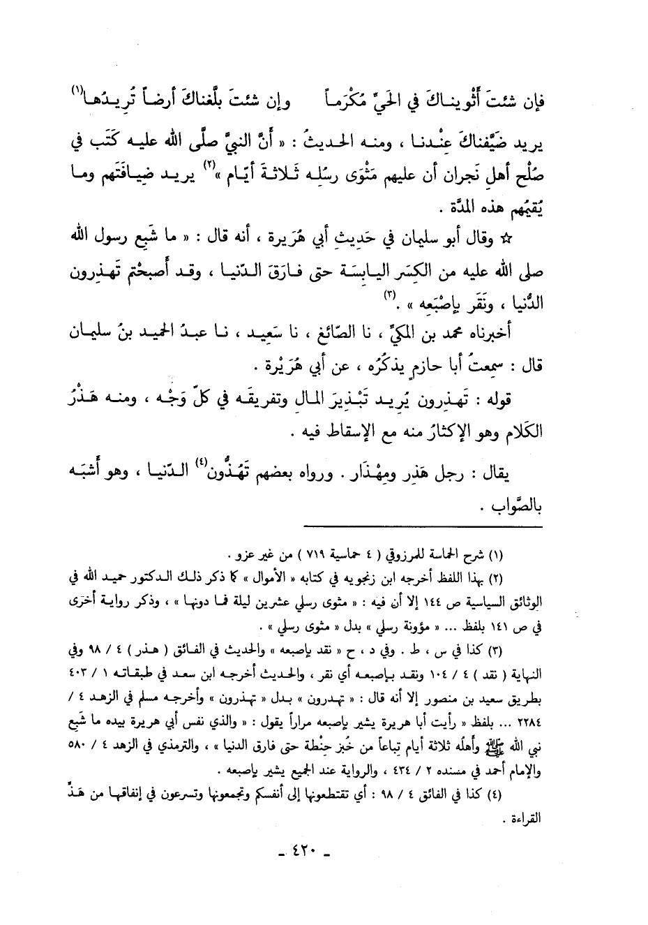 1 كذا في س, ط, وفي د, ح "نقد بإصبعه" والحديث في الفائق "هذر" "4/ 98" وفي النهاية "نقد" "4/ 104" ونقد بإصبعه أي نقر, والحديث أخرجه ابن سعد في طبقاته "1/ 403" بطريق سعيد بن منصور إلا أنه قال: "تهدرون" بدل "تهذرون" وأخرجه مسلم في الزهد "4/ 2284" ... بلفظ "رأيت أبا هريرة يشير بإصتعه مرارا يقول: "والذي نفس أبي هريرة بيده ما شبع نَبِيَّ اللَّهِ صَلَّى اللَّهُ عَلَيْهِ وسلم وأهله ثرثة أيام تباعا من خبز حنطة حتى فارق الدنيا", والترمذي في الزهد "4/ 580" والإمام أحمد في مسنده "2/ 434" والرواية عند الجميع يشير بإصبعه.