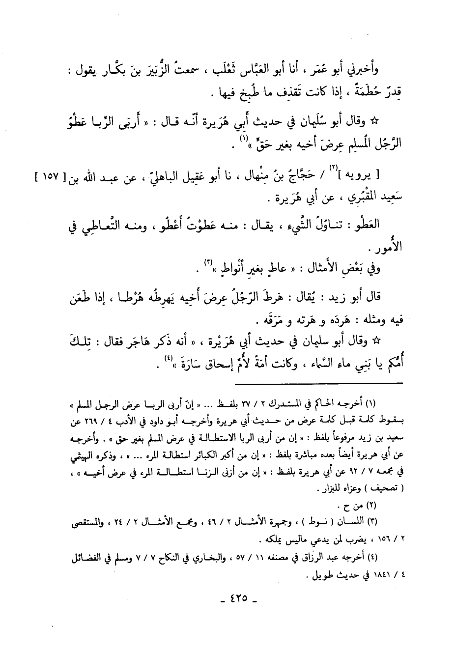 وَقَالَ أَبُو سُلَيْمَانَ فِي حَدِيثِ أَبِي هُرَيْرَةَ أَنَّهُ قَالَ: أَرْبَى الرِّبَا عَطْوُ الرَّجُلِ الْمُسْلِمِ عِرْضَ أَخِيهِ بِغَيْرِ حَقٍّ 1.