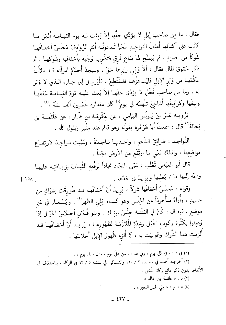 وَقَالَ أَبُو سُلَيْمَانَ فِي حَدِيثِ أَبِي هُرَيْرَةَ أَنَّهُ ذَكَرَ مَانِعُ الصَّدَقَةِ فَقَالَ: مَا مِنْ صَاحِبِ إِبِلٌ لا يُؤَدِّي حَقَّهَا إِلا بُعِثَتْ لَهُ يَوْمَ الْقِيَامَةِ أَسْمَنُ مَا كَانَتْ عَلَى أَكْتَافِهَا أَمْثَالُ النَّوَاجِدِ شَحْمًا تَدْعُونَهُ أَنْتُمُ الرَّوَادِفَ مُحْلَسٌ أَخْفَافُهَا شَوْكًا مِنْ حَدِيدٍ ثُمَّ يَبْطِحُ لَهَا بِقَاعِ قَرِقٍ فَتَضْرِبُ وَجْهَهُ بِأَخْفَافِهَا وَشَوْكِهَا ثُمَّ ذَكَرَ حُقُوقَ الْمَالِ فَقَالَ: أَلا وَفِي وَبَرِهَا حَقٌّ وَسَيَجِدُ أَحَدُكُمُ امْرَأَتَهُ قَدْ مَلأَتْ عِكْمَهَا مِنْ وَبَرِ الإِبِلِ فَلْيُنَاهِزُهَا فَلْيَقْتَطِعُ فَلْيُرْسِلُ إِلَى جَارِهِ الَّذِي لا وَبَرَ لَهُ وَمَا مِنْ صَاحِبِ نَخْلٍ لا يُؤَدِّي حَقَّهَا إِلا بُعِثَ عَلَيْهِ يَوْمَ الْقِيَامَةِ سَعَفُهَا وَلِيفُهَا وَكَرَانِيفُهَا أَشَاجِعَ تَنْهَسُهُ فِي يَوْمٍ 1 كَانَ مِقْدَارُهُ خَمْسِينَ أَلْفَ سَنَةٍ 2.